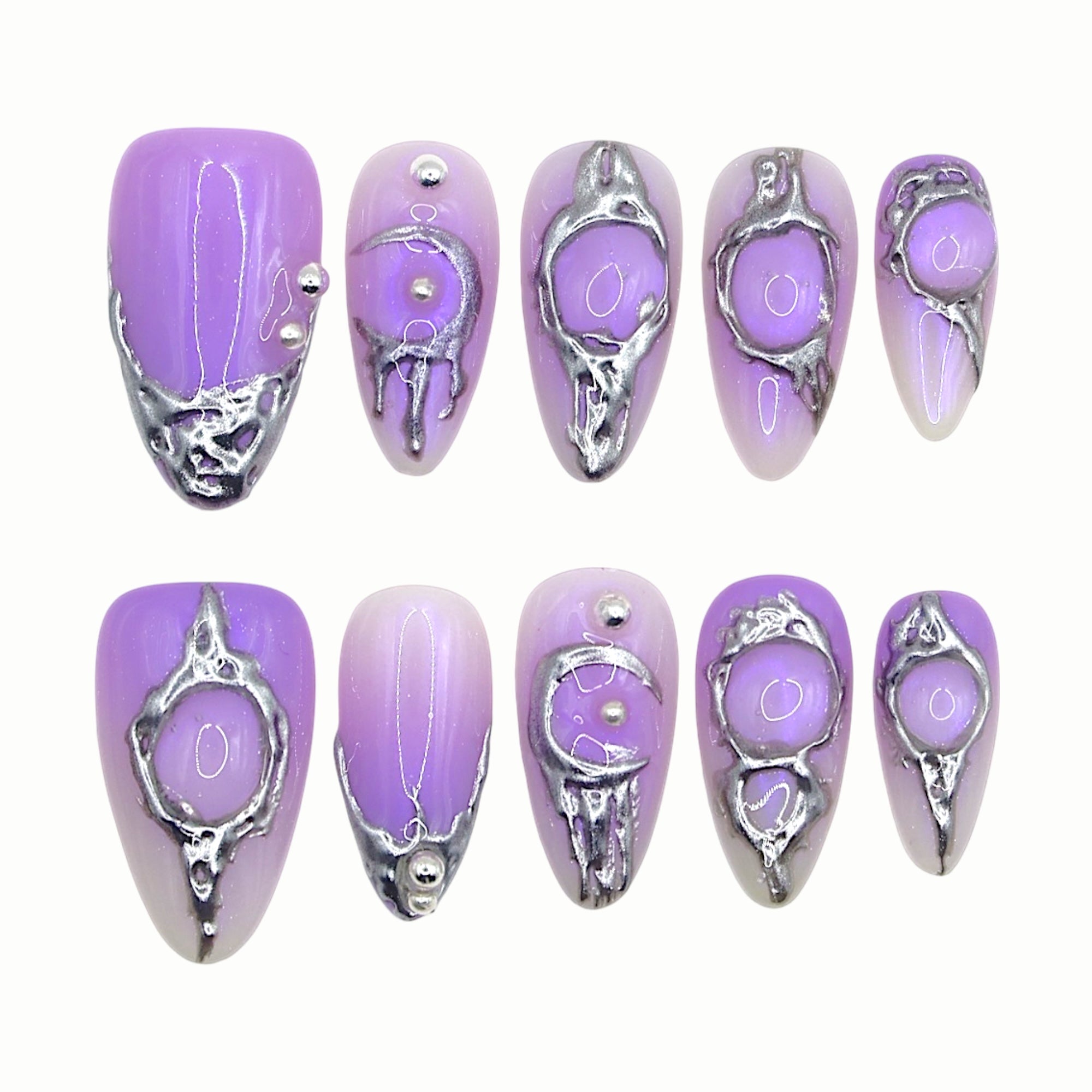 Textured silver rings and crescent moons float over an amethyst base—mystical, minimal, and futuristic like encrypted signals under a lunar eclipse.