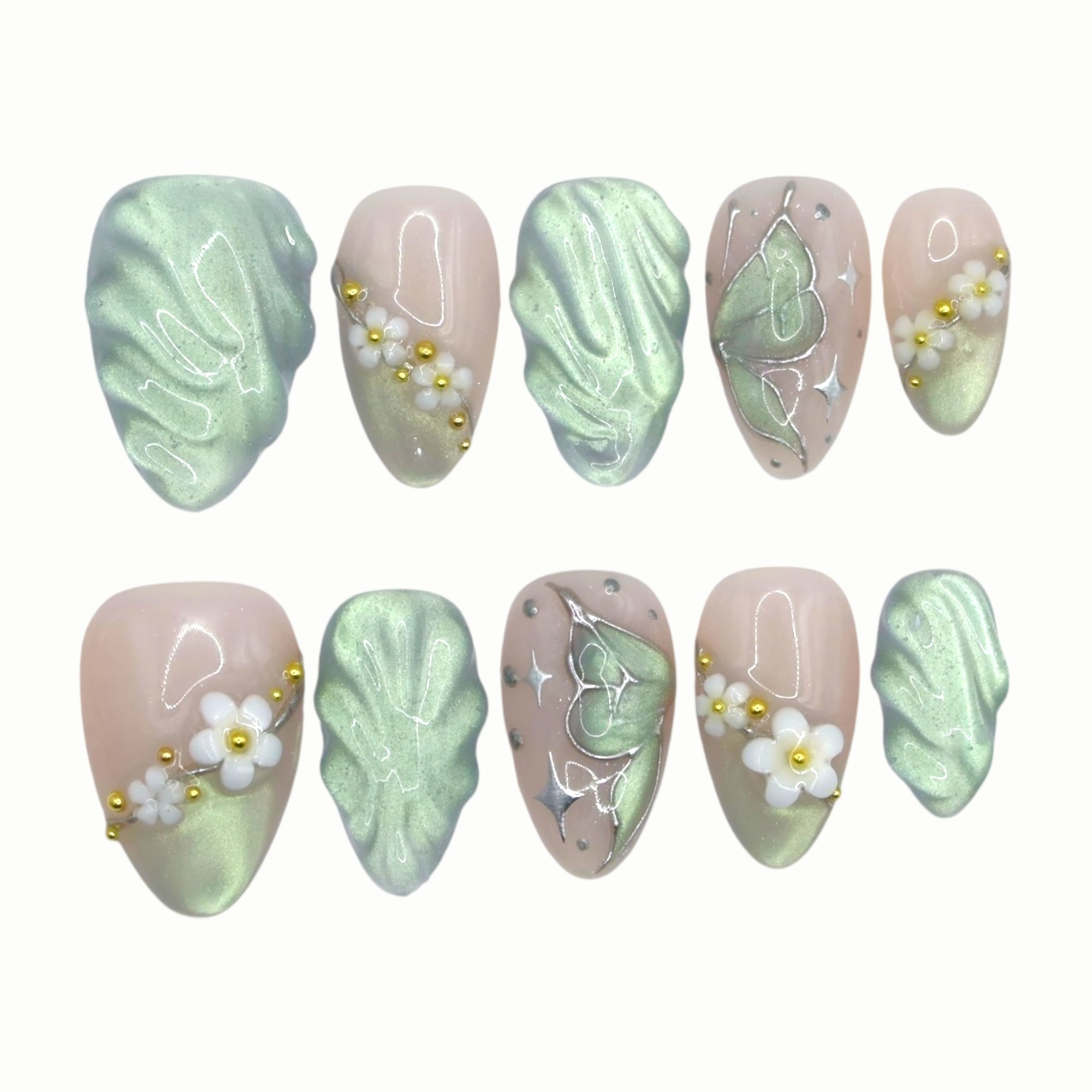 Shimmering mint shades paired with delicate blossoms and butterfly outlines evoke the whisper of nature — gentle, graceful, and effortlessly fresh.