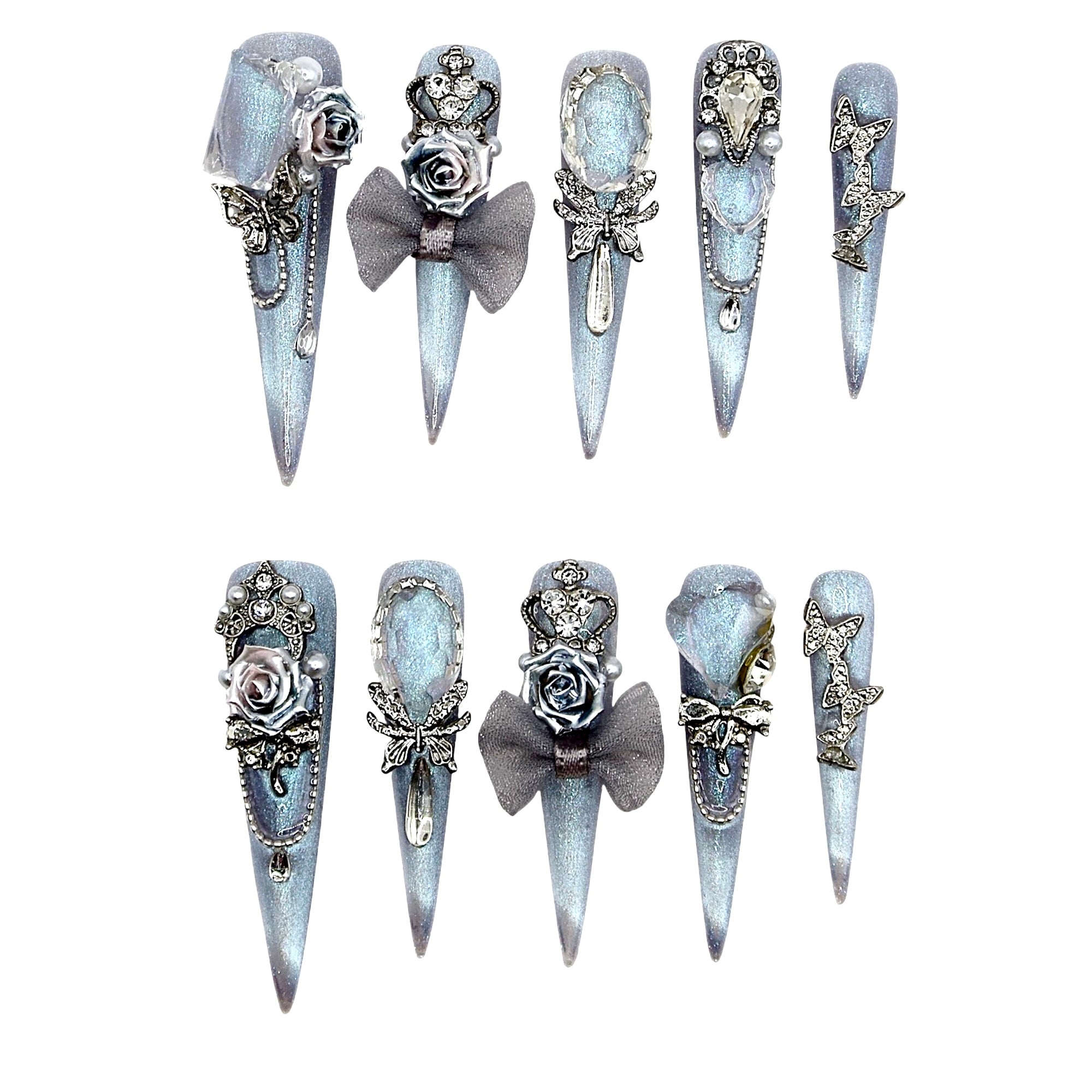 Featuring a frosted blue base with silver roses, butterflies, and crystal embellishments, adorned with delicate bows, this design evokes the charm of a fairytale bridal look. It radiates elegance, romance, and a touch of icy nobility.