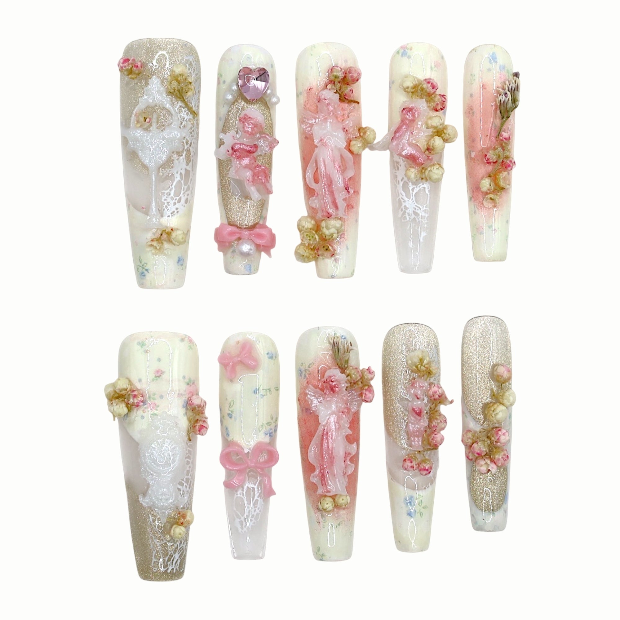 With a creamy white and soft pink-gold base, adorned with embossed angels, bows, and dried floral accents, this design exudes a delicate Rococo charm. It evokes the elegance of a royal garden, blending romance, art, and dreamy sophistication.