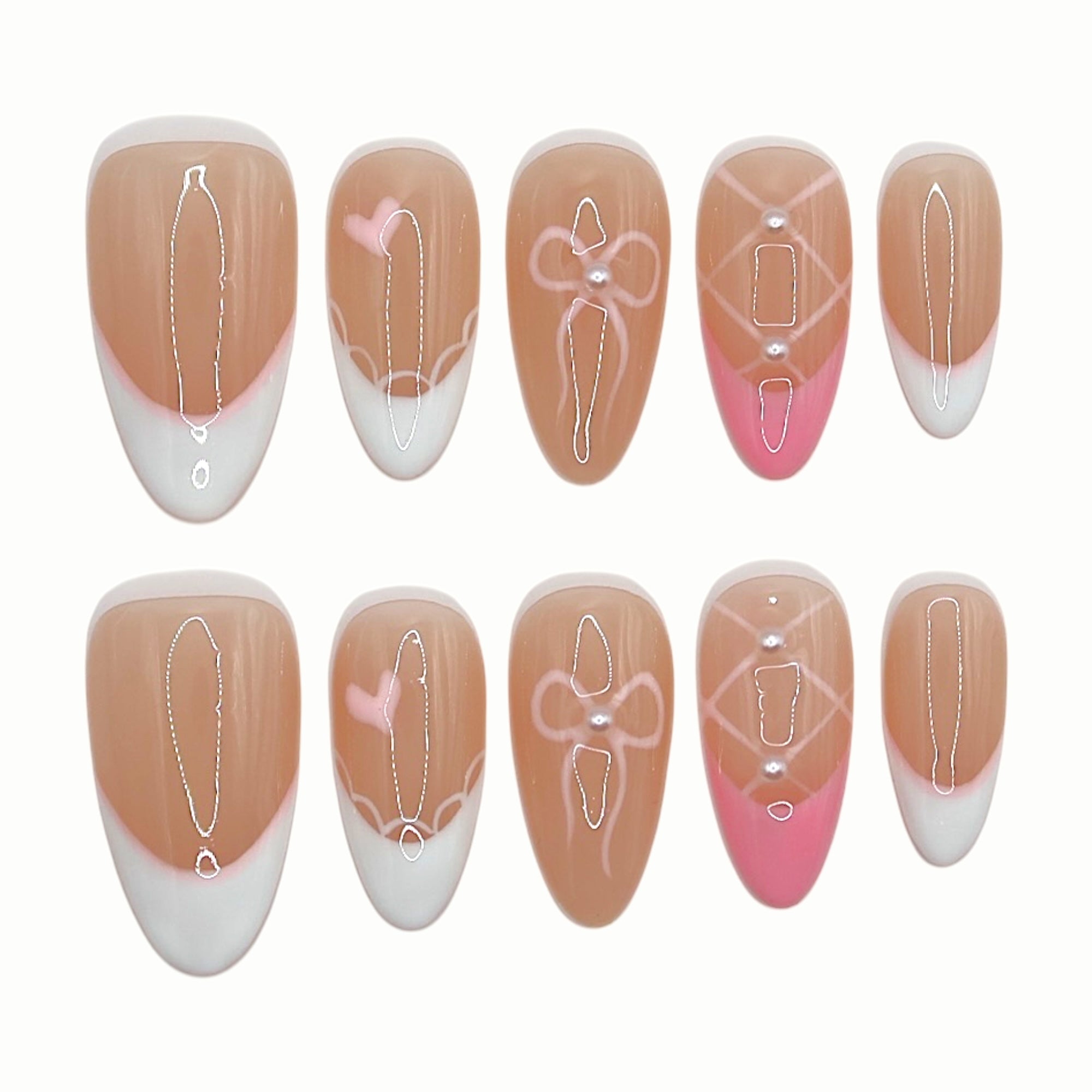 Built on a peachy milk-tea base, this set features soft white French tips, hand-drawn hearts, and delicate ribbon details. The tiny pearls add a subtle touch of charm, creating a sweet, airy look that feels like a little love note on your fingertips. Perfect for daily wear, dates, and anyone who loves a soft, girly vibe.