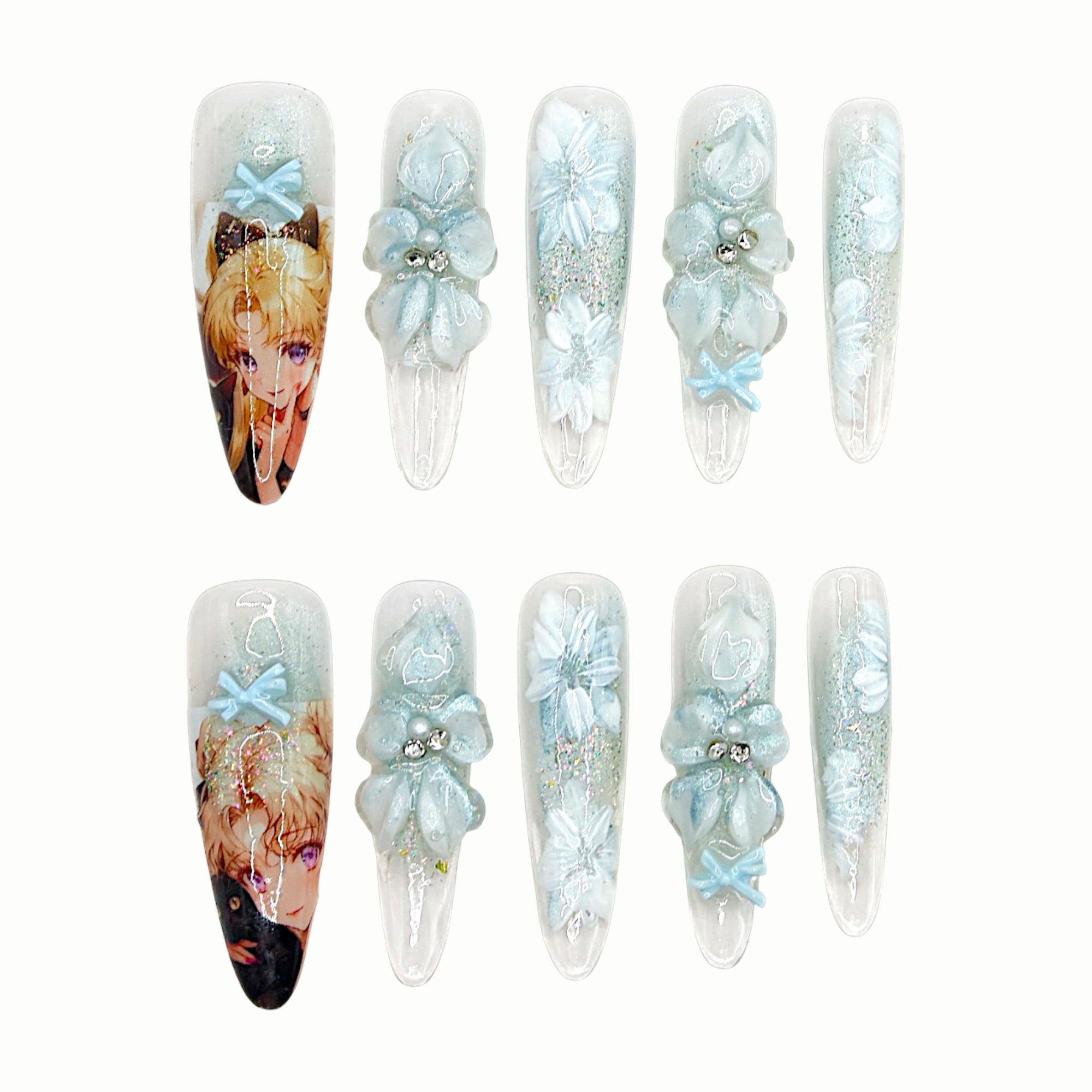 An icy blue translucent base with anime character art and sculpted florals—cool, dreamy, and delicately expressive.