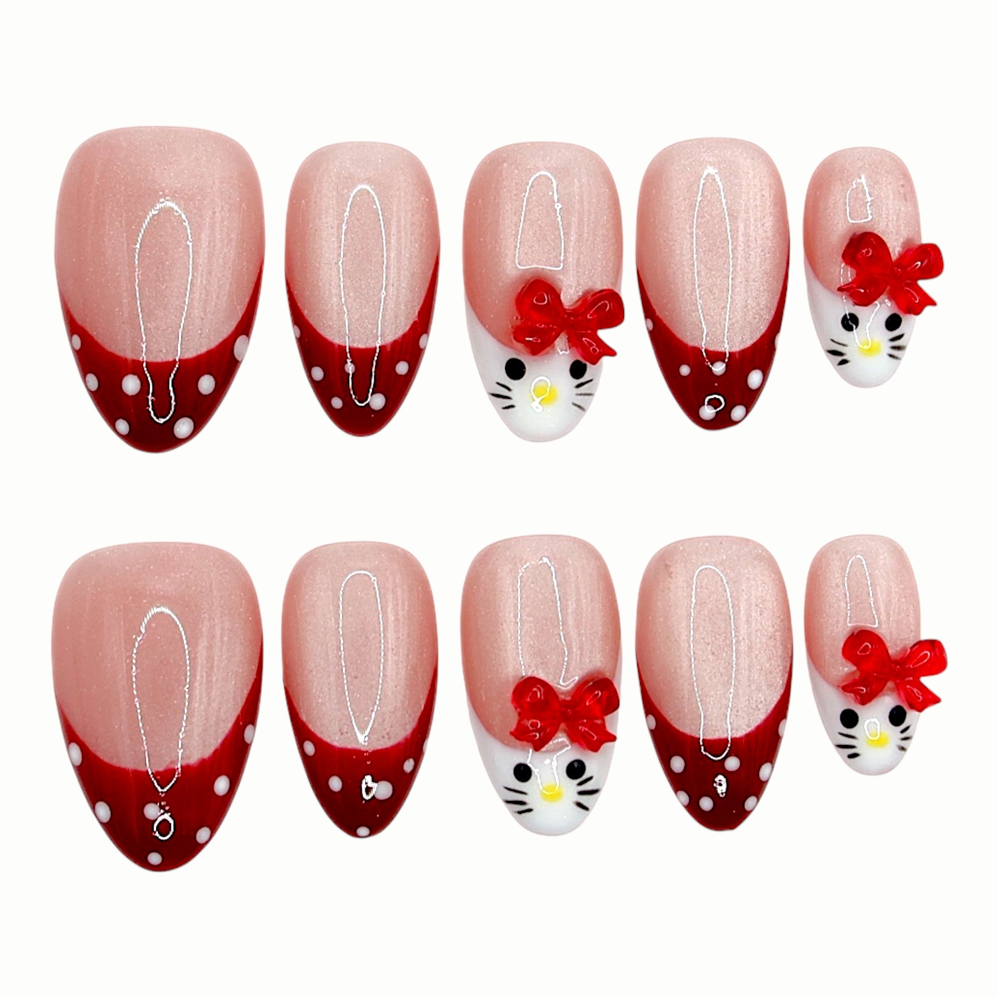 A playful red-and-white French design featuring cute cat faces and 3D bows — sweet, festive, and age-softening. The rounded short shape keeps it fun and wearable for everyday or holidays.