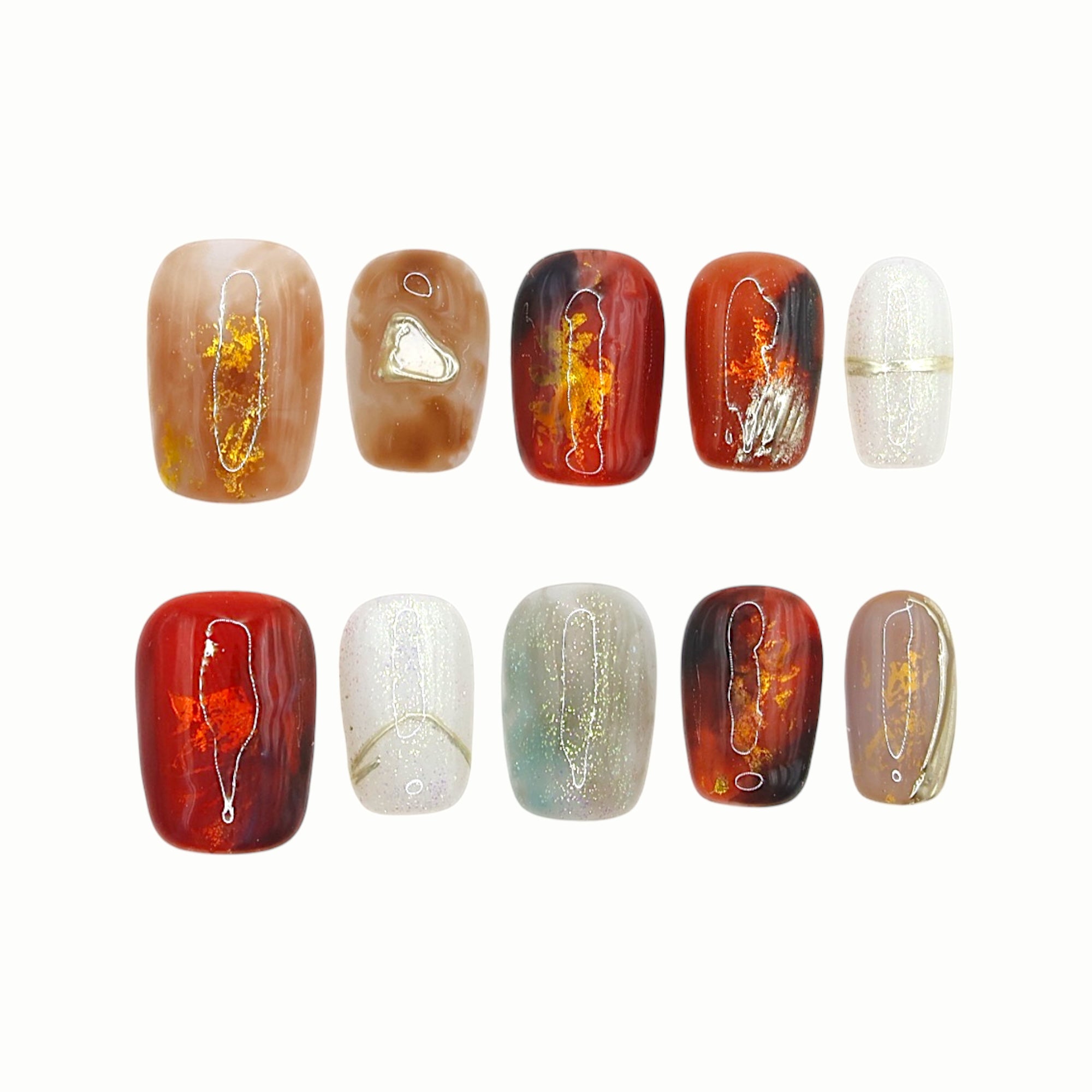This design features a base of rich red and earthy brown, accented with glowing golden-orange textures reminiscent of molten lava flowing through stone. The semi-translucent grey and mineral-like details add depth and mystery, representing the coexistence of passion and calmness—like embers that quietly burn, powerful yet restrained.