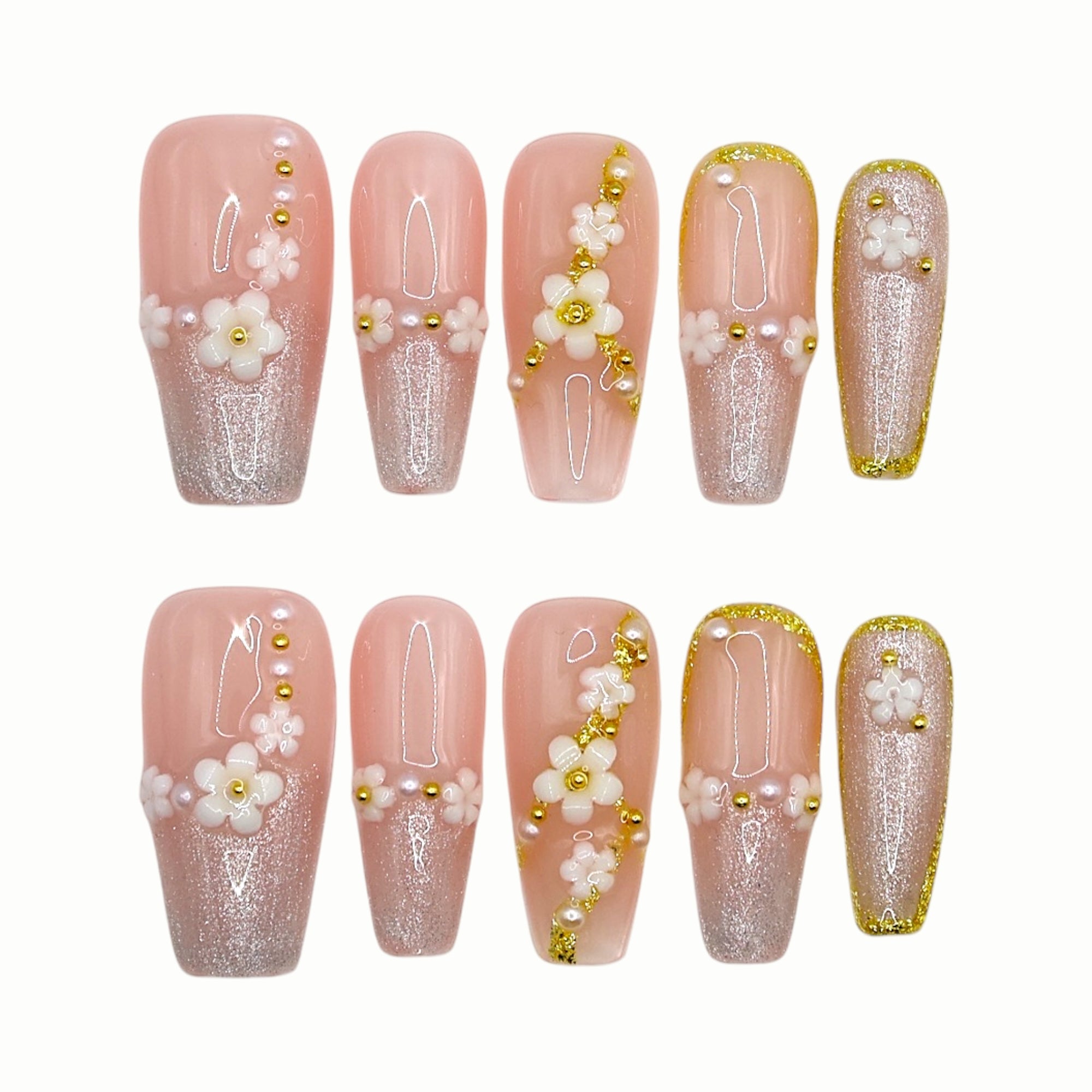 Featuring a graceful ombré from translucent pink to sparkling silver, highlighted by charming white floral appliqués and dainty pearl and gold bead details, for a touch of refined elegance.