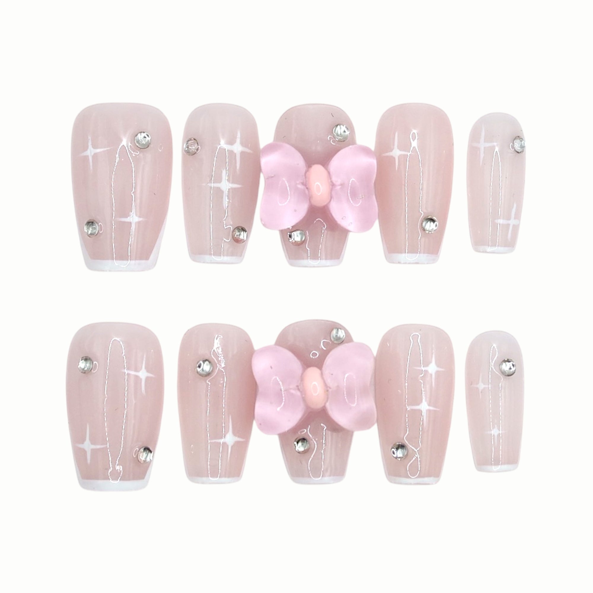 Soft milky pink with sparkly gems and 3D bows gives this set a playful, sugary feel—like bubbles of sweetness dancing at your fingertips. It’s the perfect pick for those who love everything cute and sparkly.