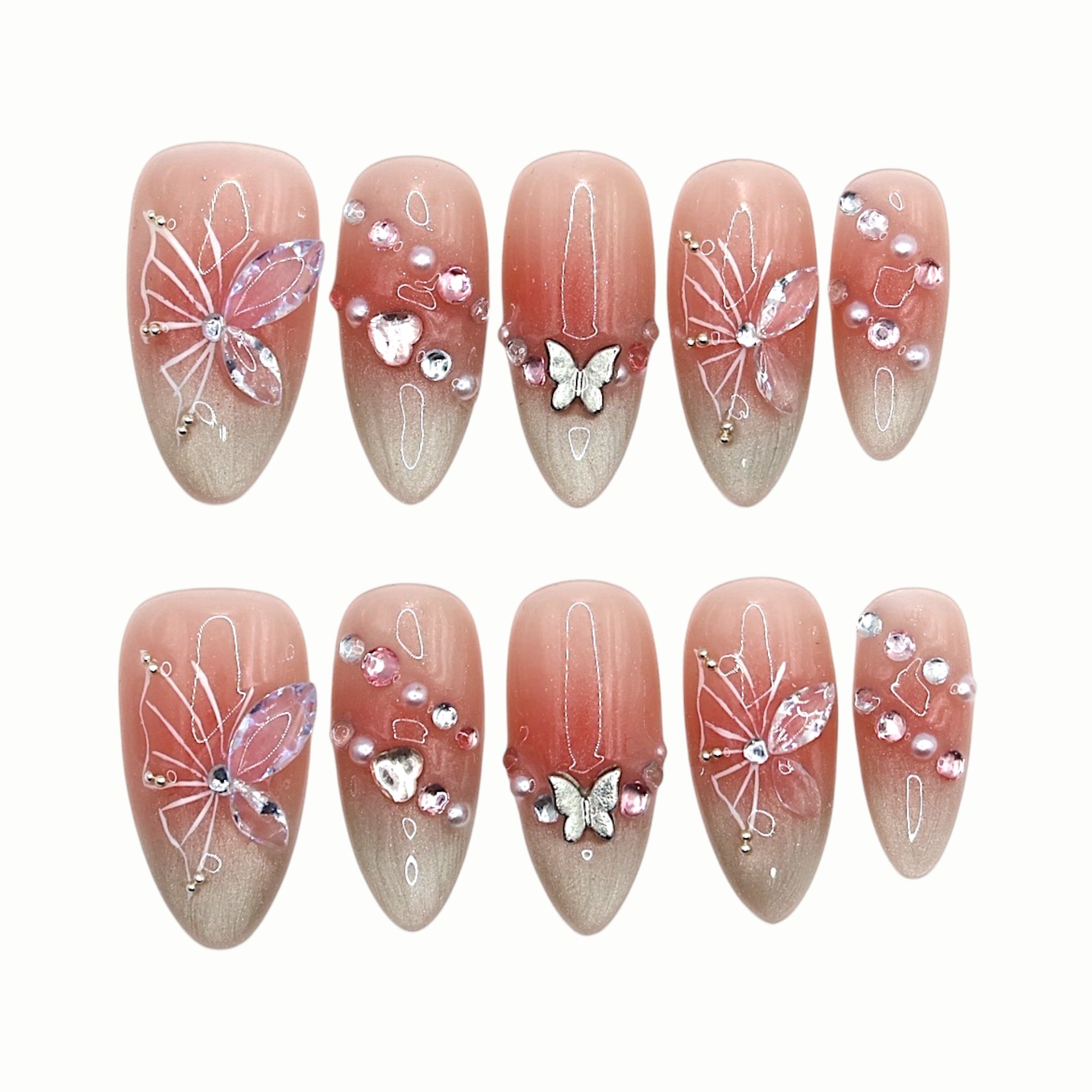 Crystal Flutter captures the delicate motion of butterflies in early spring, with translucent wings outlined in soft shimmer and sparkling gems that resemble morning dew. It’s a romantic design that blends elegance with nature’s grace.