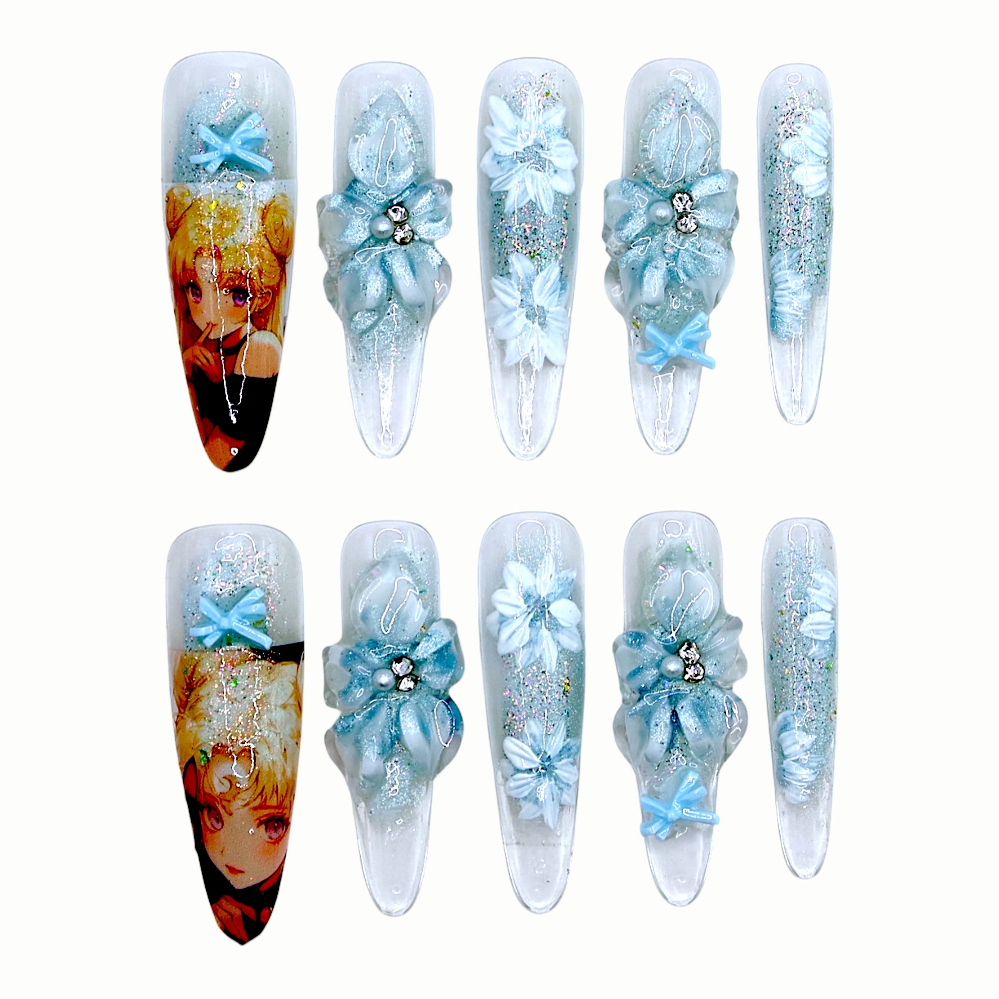 An icy blue gradient like winter sky at dawn, dusted with shimmer like scattered wishes, finished with soft bows and anime-inspired charm. Perfect for conventions, winter dates, festive outings, and statement photos.