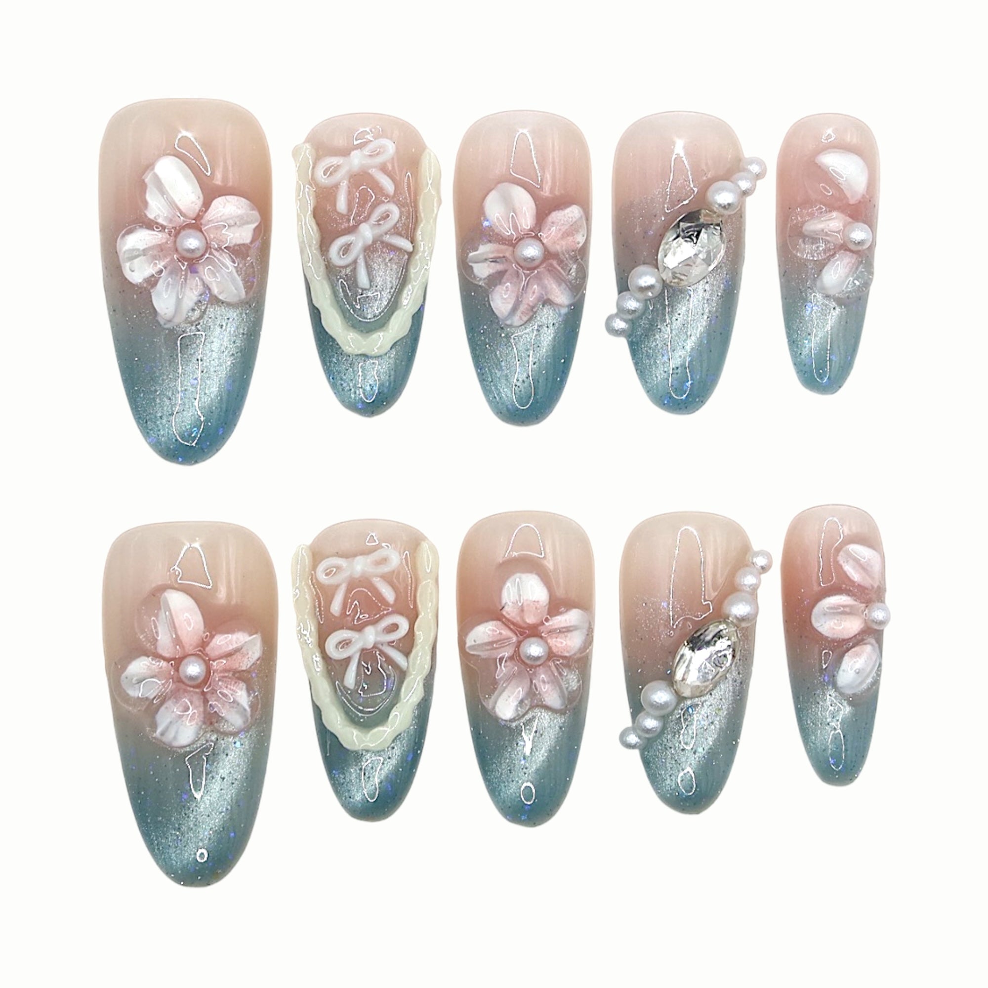 This design captures the elegance of ocean tides and moonlit flowers. The gradient of nude pink to shimmering teal evokes the calm of twilight seas, while pearls and crystals symbolize purity and luxury. 3D blossoms soften the look, creating a dreamy yet sophisticated aura.