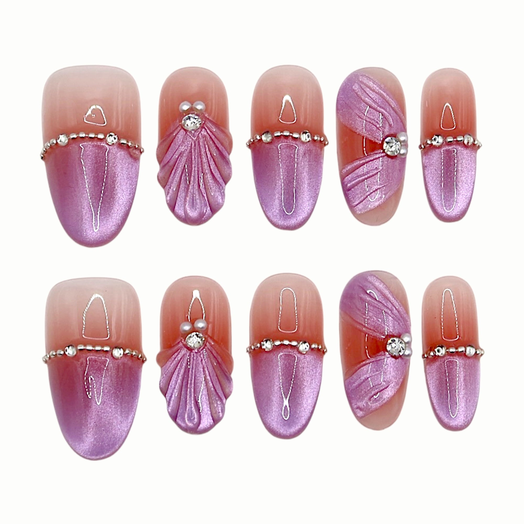 Gradient purple cat-eye base featuring 3D pleated shell textures and pearl accents. A dreamy, mermaid-inspired aesthetic.