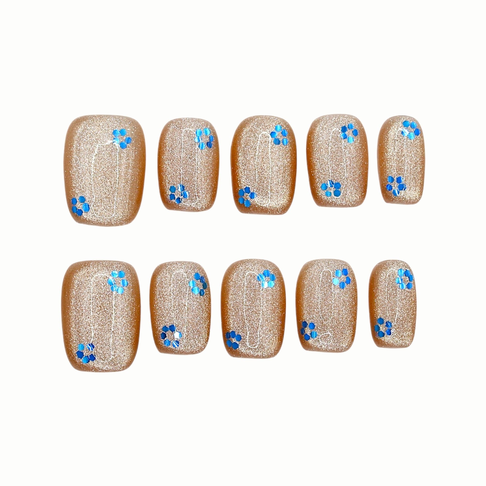 A golden glitter base resembling the glowing desert, adorned with vivid blue flowers, symbolizing unexpected blooms and resilience in the wild.