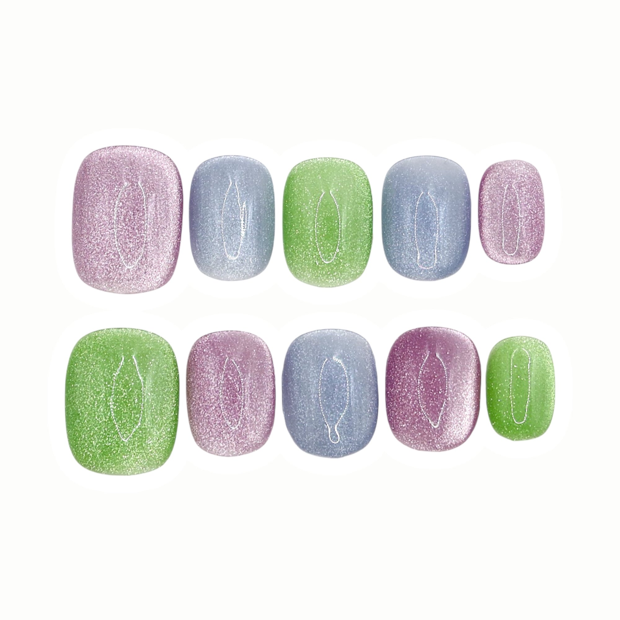 A playful mix of lilac, mint, and sky blue with glittery cat-eye sparkles—like catching stardust in a candy jar.