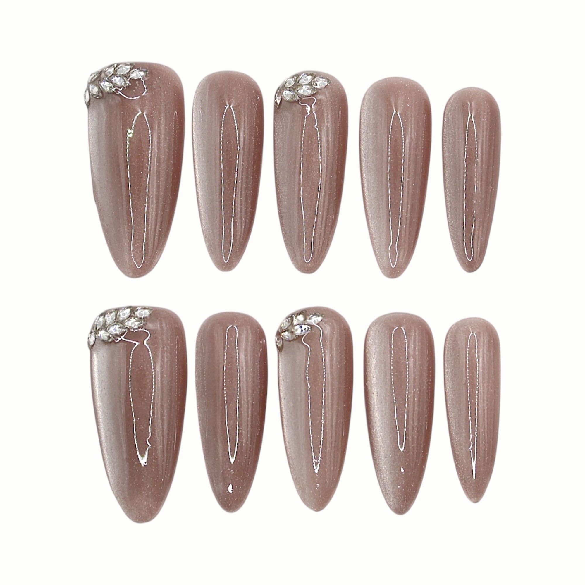 Elegantly capturing the warm richness of mocha, this design features delicate, shimmering rhinestone embellishments that blossom like delicate foliage, adding a touch of sophisticated sparkle.