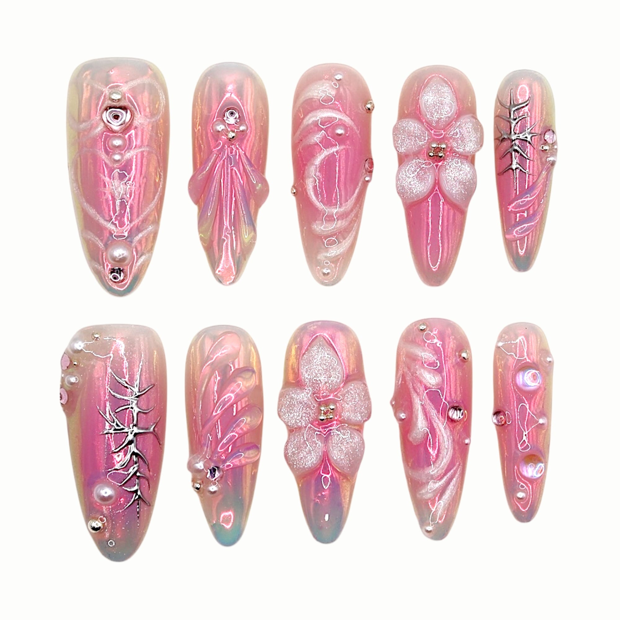 A translucent pink base layered with sculptural gel lines, pearls, and soft chrome details. Inspired by ancient symbols and forgotten artefacts, this design feels like a delicate relic from a dreamy future world — romantic, mysterious, and quietly powerful.