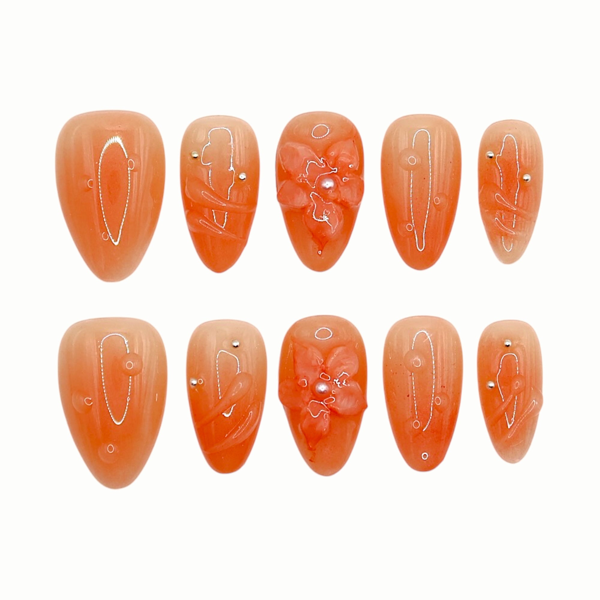 A translucent apricot-orange jelly base with soft sculpted florals and subtle shine. Fresh, juicy, and lightweight — like sun-ripened fruit glowing under summer light.