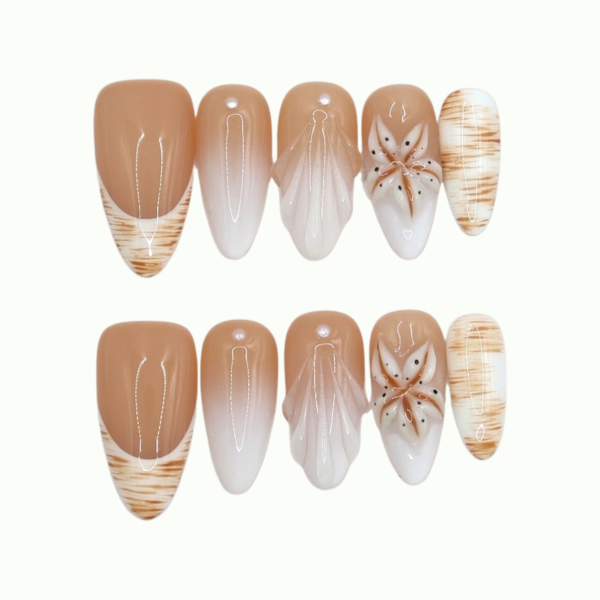 Coconut Shell captures the essence of a tropical escape — seashell textures and creamy coffee gradients blend into a soft, beachy harmony. The flowing shell lines and sculpted floral accents evoke the feeling of warm sand, ocean breeze, and barefoot serenity. A natural, relaxed look full of island elegance.
