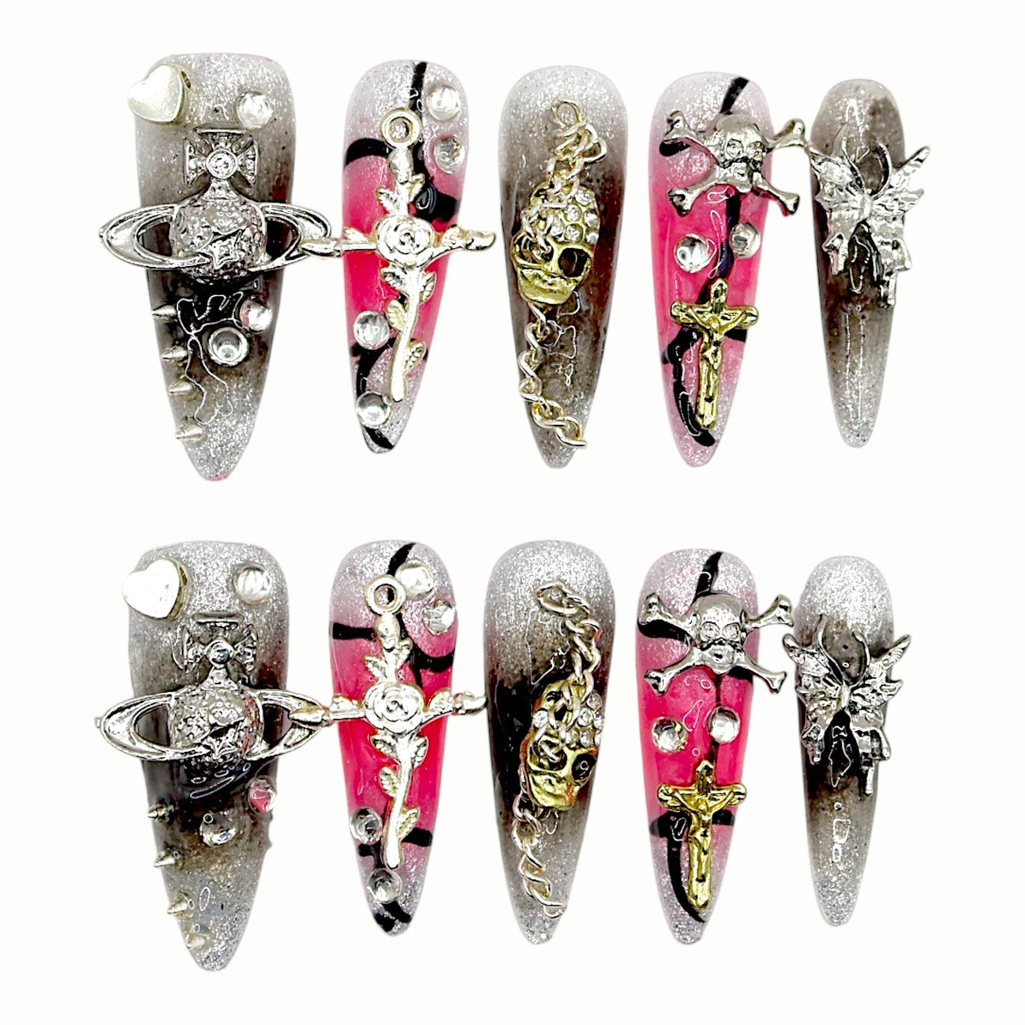 Metallic planets, gothic crosses, skull chains, and deep smoke gradients collide with neon pink to create a space-punk aesthetic. It’s futuristic, rebellious, and dramatic — like a cosmic battle between sweetness and darkness.