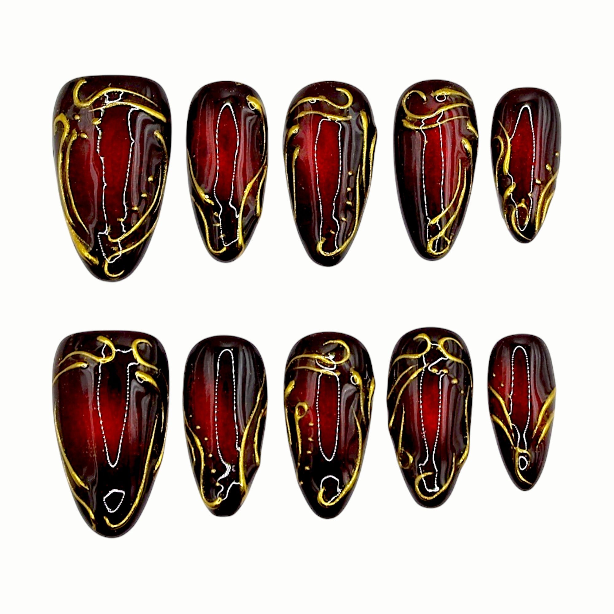 This design features a deep crimson base with a fiery gradient glow, adorned with flowing golden lines that resemble molten gold streaming through the night. It radiates mystery and opulence, carrying a touch of dangerous allure. Like fine red wine and blazing fire, it embodies passion, strength, and irresistible charm.
