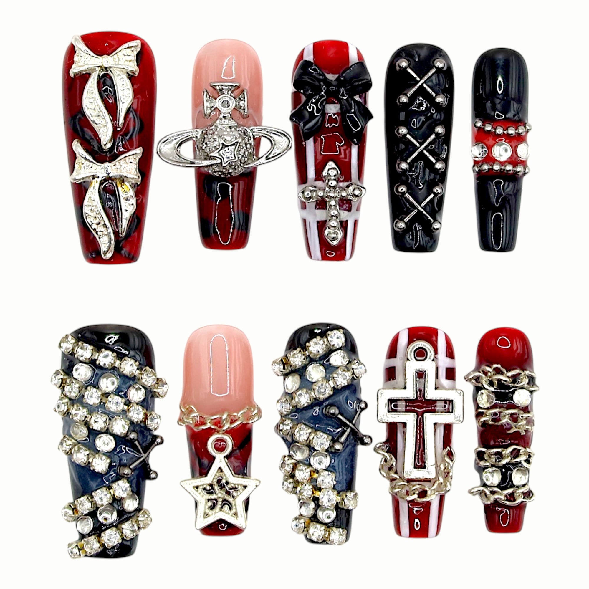A bold mix of blood-red chrome, deep black lacquer, metal crosses, chained gems, and punk ribbons. This set feels like a rebellious rock concert wrapped in luxury — fierce, glamorous, and unapologetically dramatic.