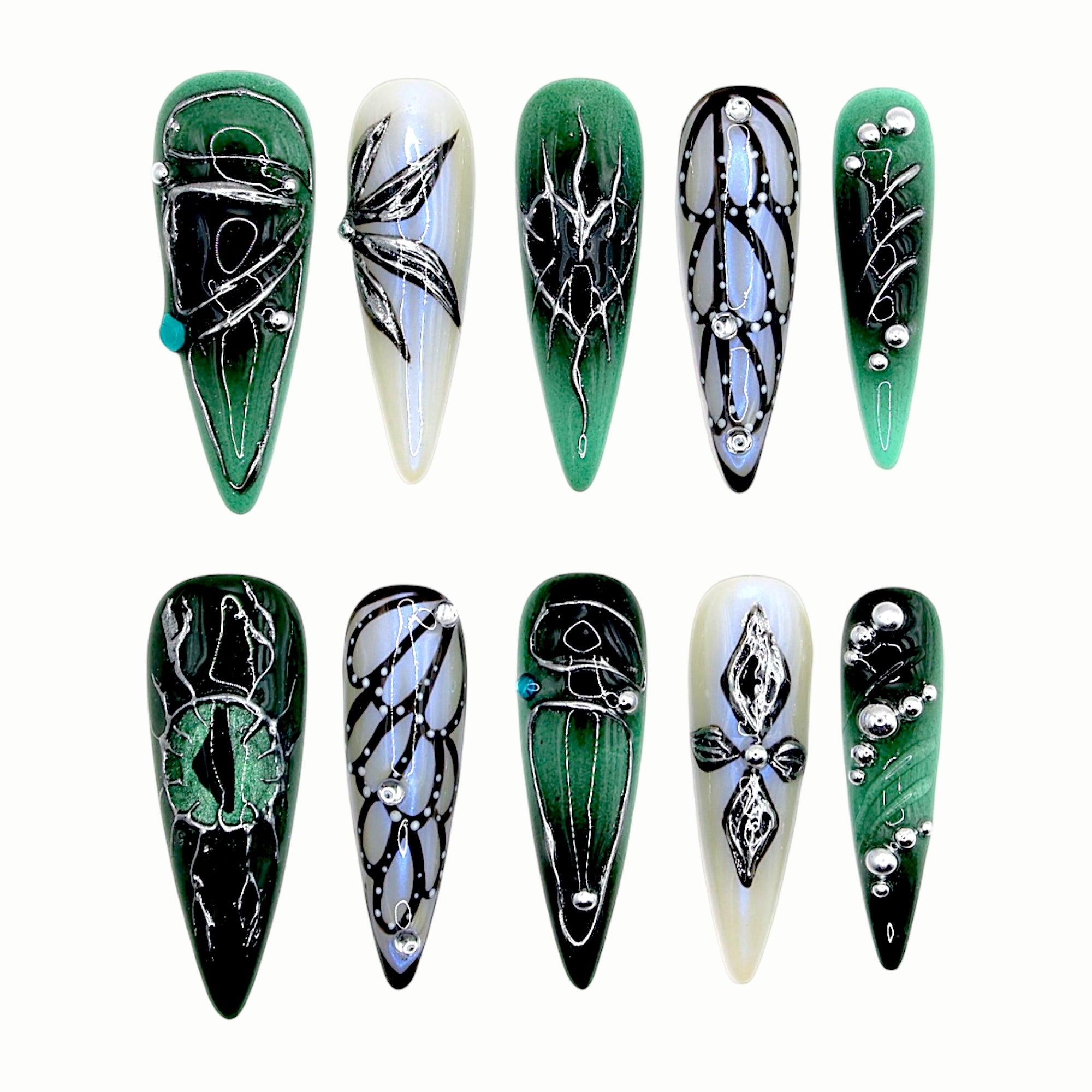 Deep emerald gradients and silver carvings evoke mysterious symbols hidden within an enchanted forest.