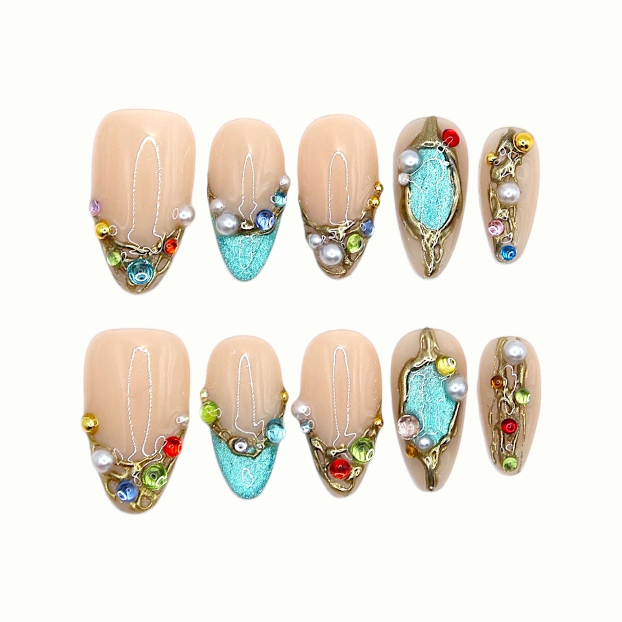 A nude base paired with turquoise tones and multicolored gems evokes vintage jewelry treasures from an island—ornate yet refined.