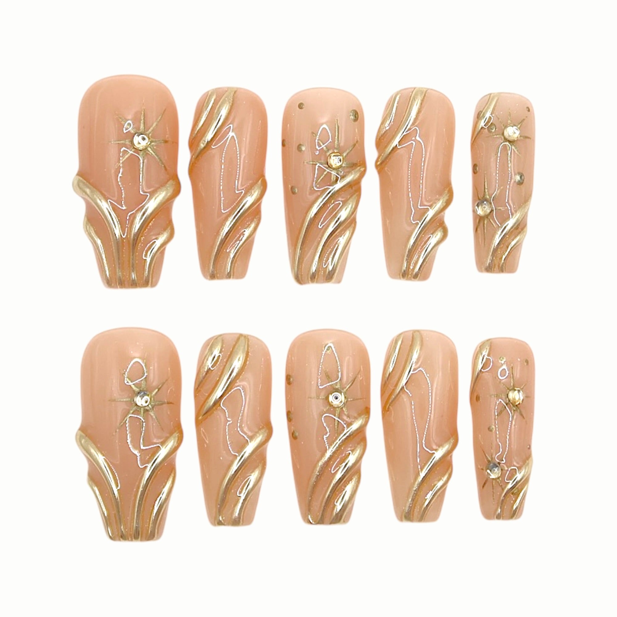 A soft nude base with flowing gold lines that mimic organic movement, accented with delicate florals for an understated luxury feel.