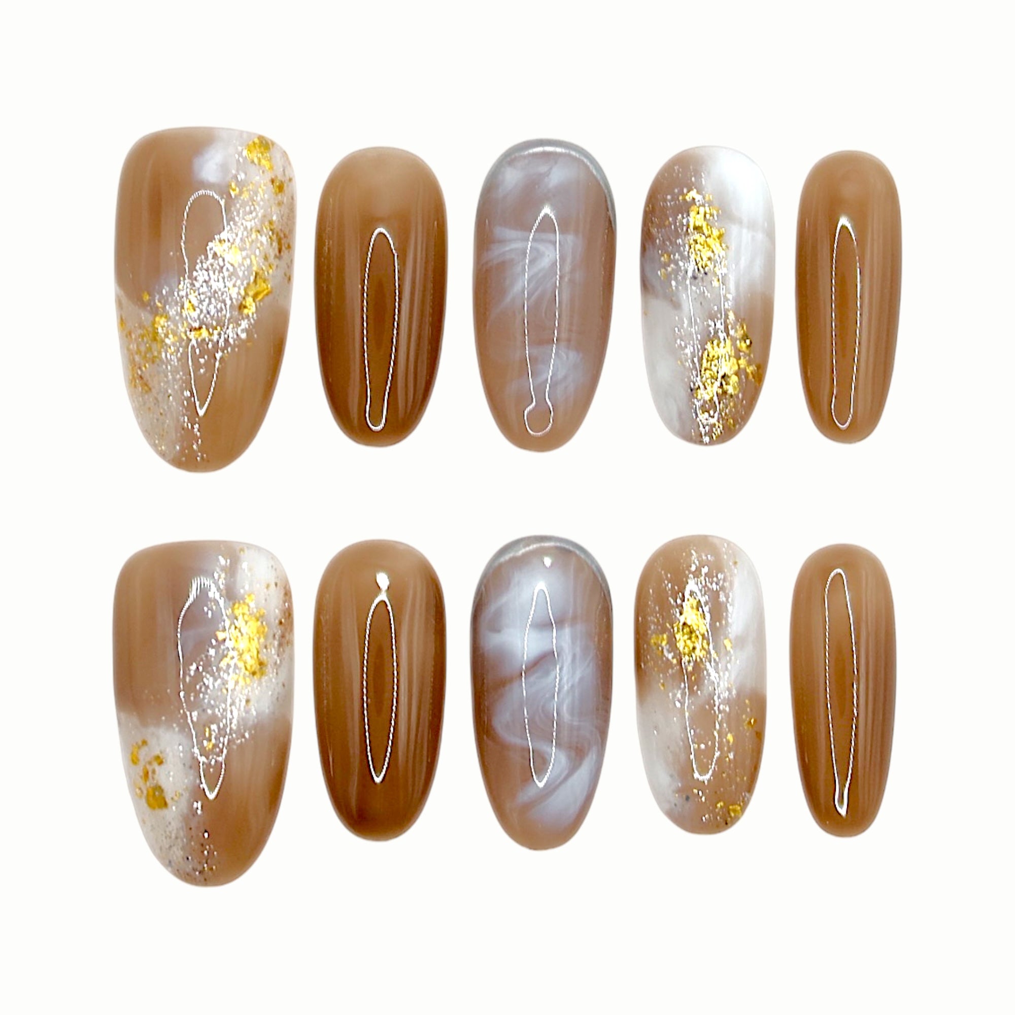 Caramel-brown base with milky marble veils and fine gold foil. Soft sheen, not flashy; medium oval length elongates the fingers—easy for work and everyday.