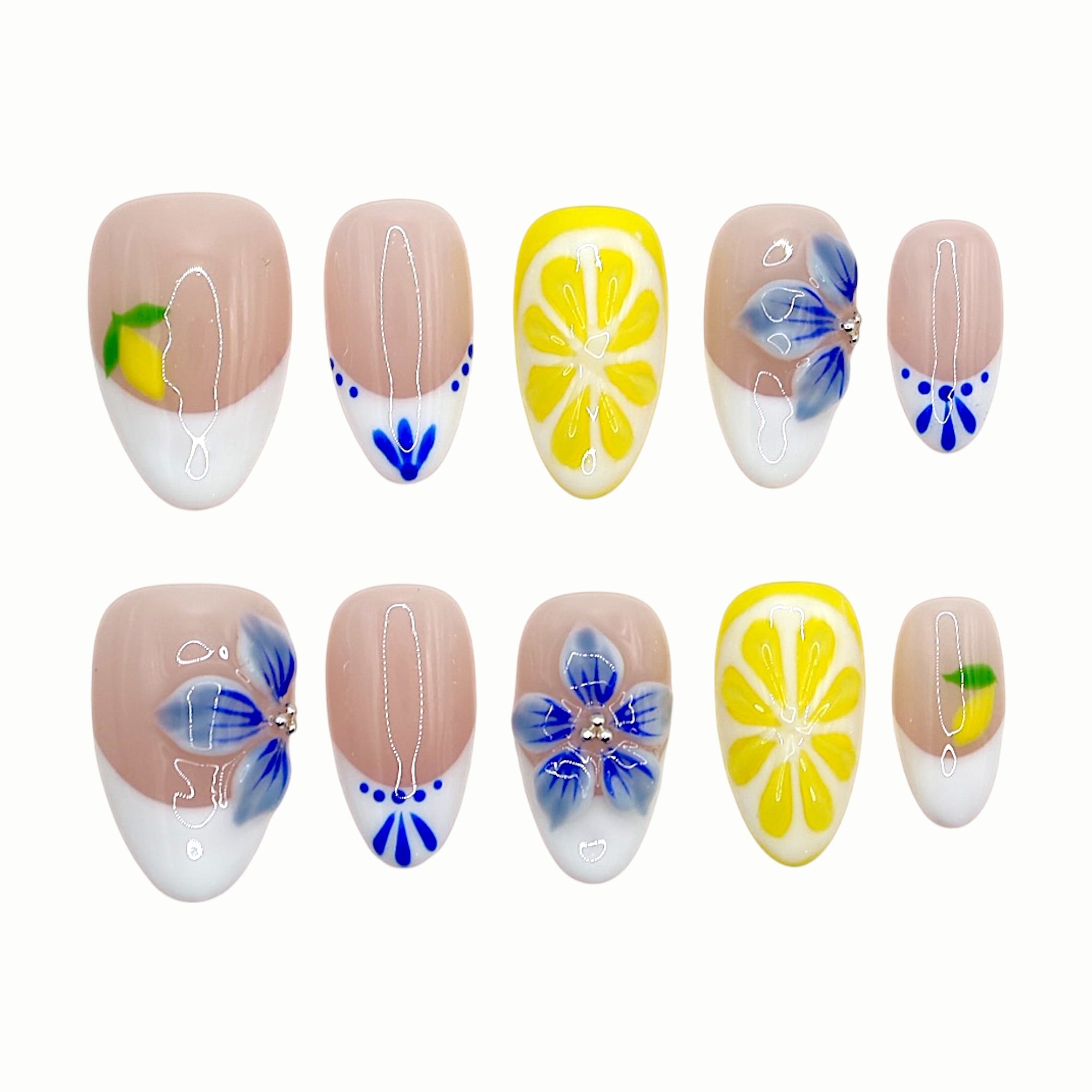 Bright lemon slices and blue blossoms sit on a clean nude base, capturing the fresh joy of summer.