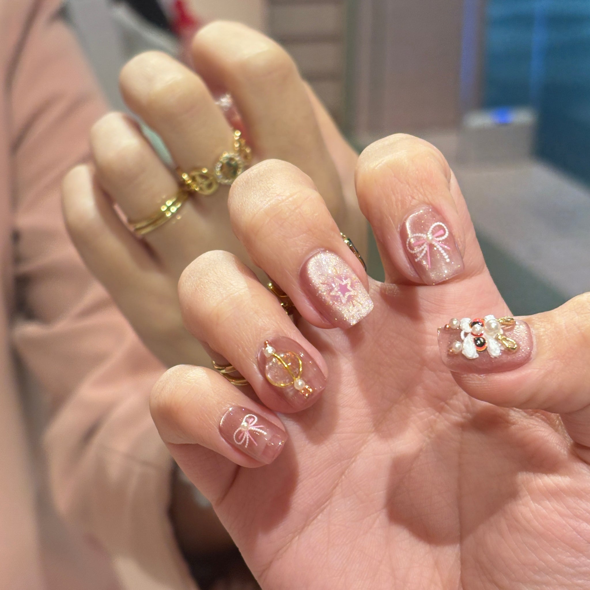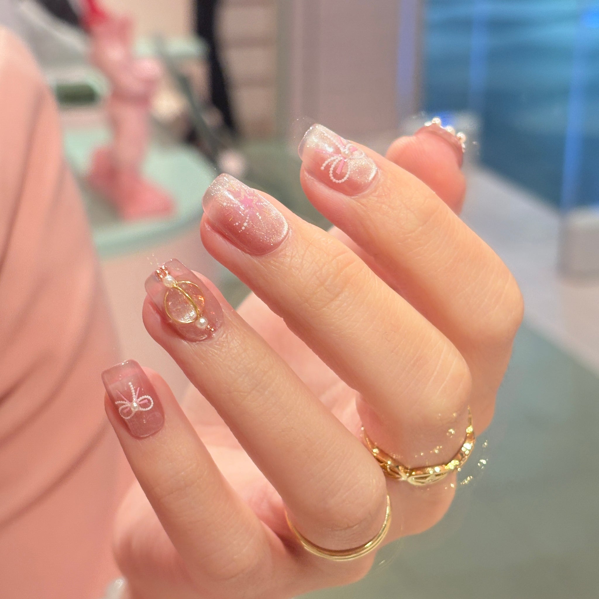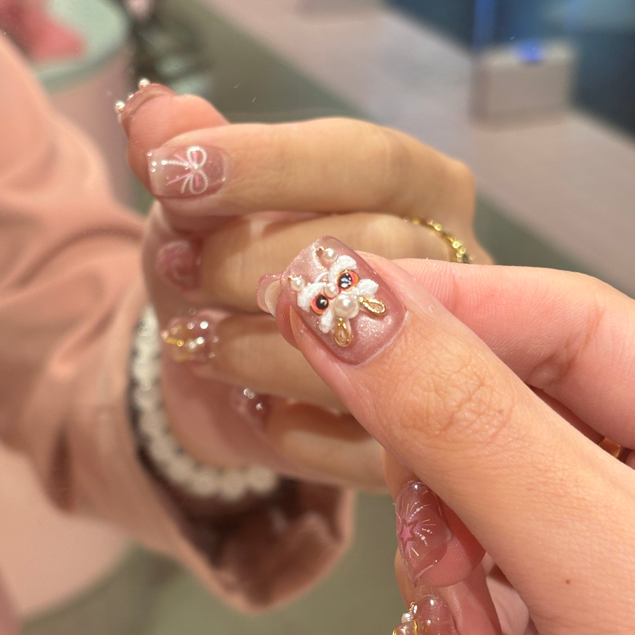 A soft pink shimmer base adorned with a dimensional lion charm and delicate bows. Inspired by the festive lion dance symbol of protection and prosperity, this design reimagines tradition through a sweet, contemporary lens — playful yet auspicious.