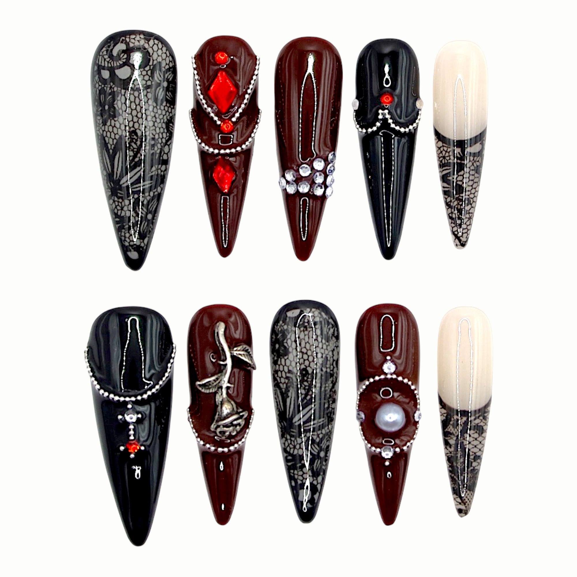 Dominated by deep burgundy and black, this set features delicate lace patterns and chain-like embellishments, exuding mystery and elegance. Ruby-like accents and pearl details evoke the allure of fine jewelry at a midnight ball, blending gothic coolness with refined femininity.