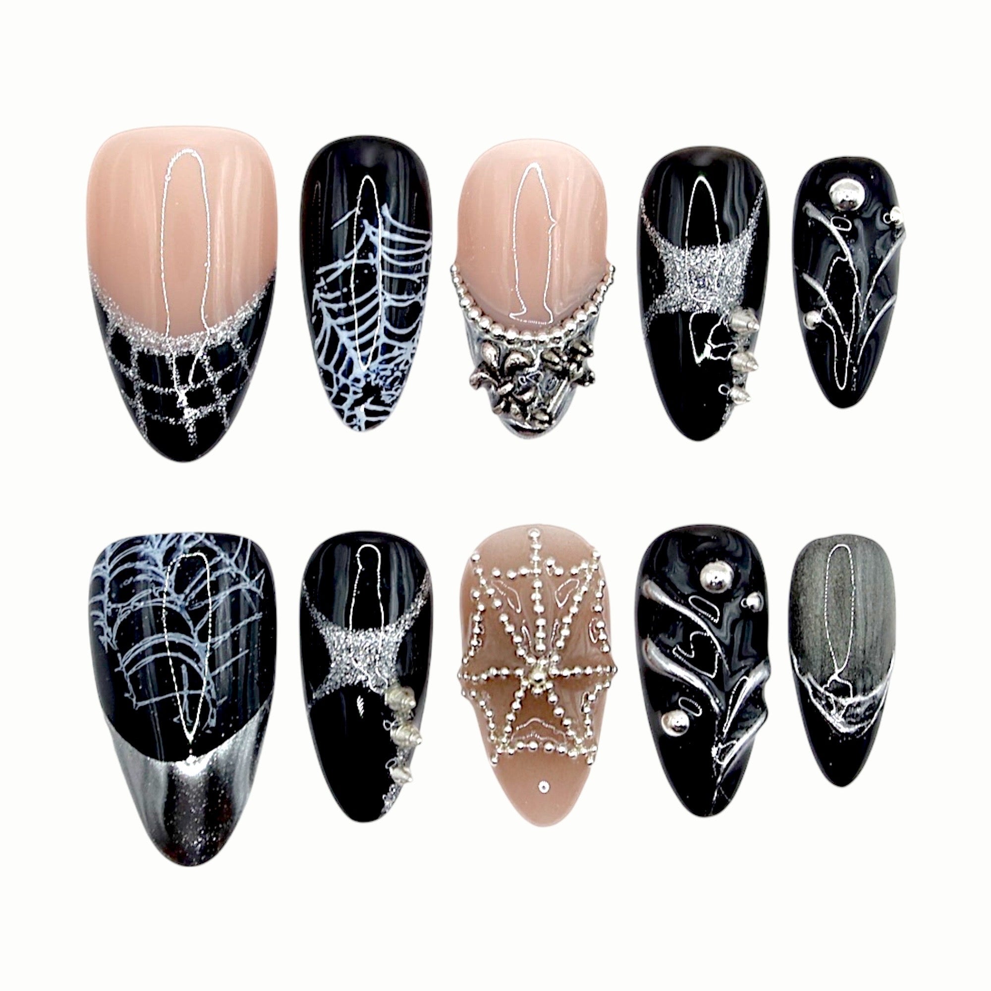 This nail set features a combination of black and nude tones, accented with silver lines and bead embellishments that depict intricate spider webs and metallic textures. Like webs spreading silently in the night, it exudes mystery and a subtle sense of danger. The silver bead chains add a bold touch of luxury, making the design a perfect symbol of dark elegance and irresistible power.
