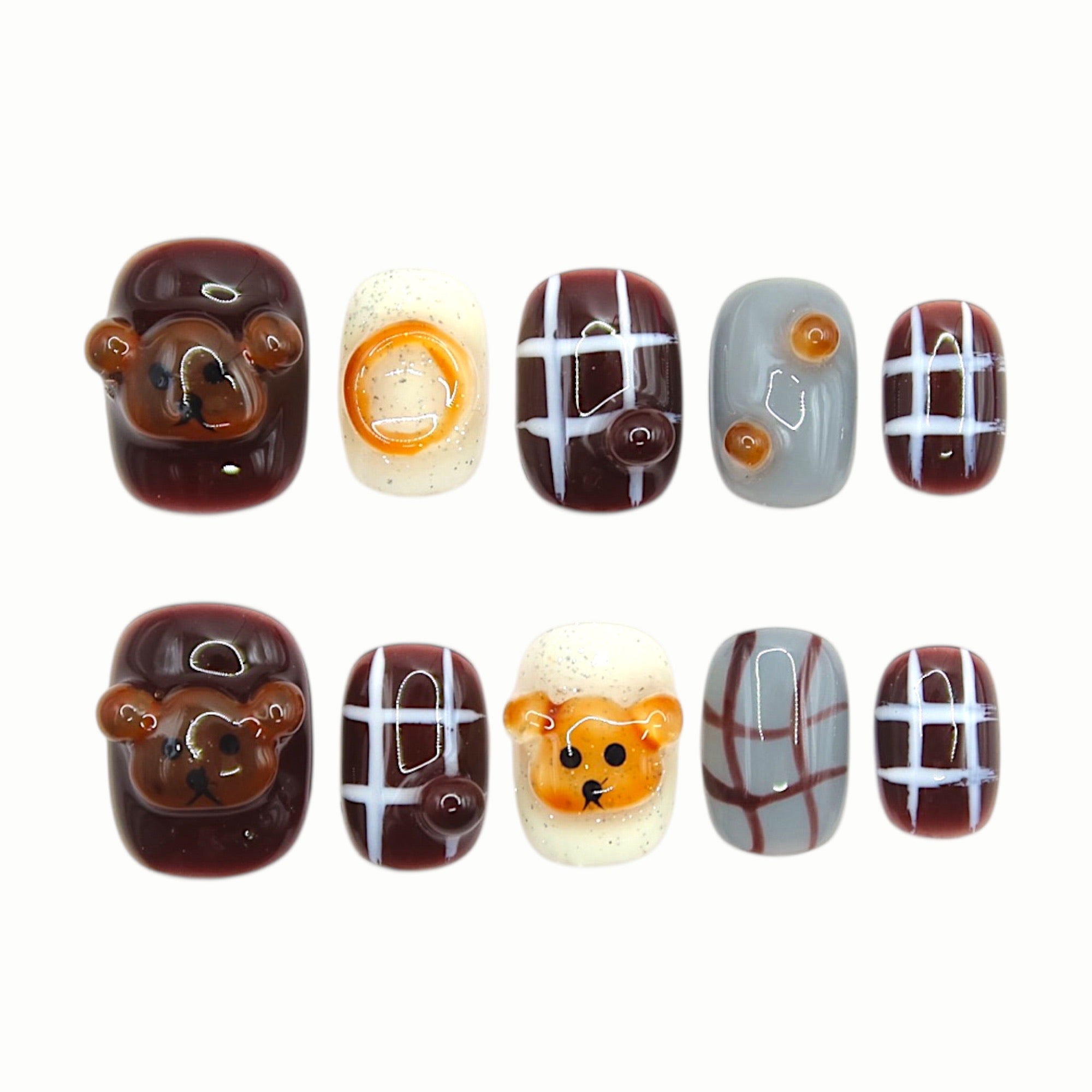 A caramel palette with 3D teddy bears and creamy accents creates a soft, dessert-like and playful vibe.