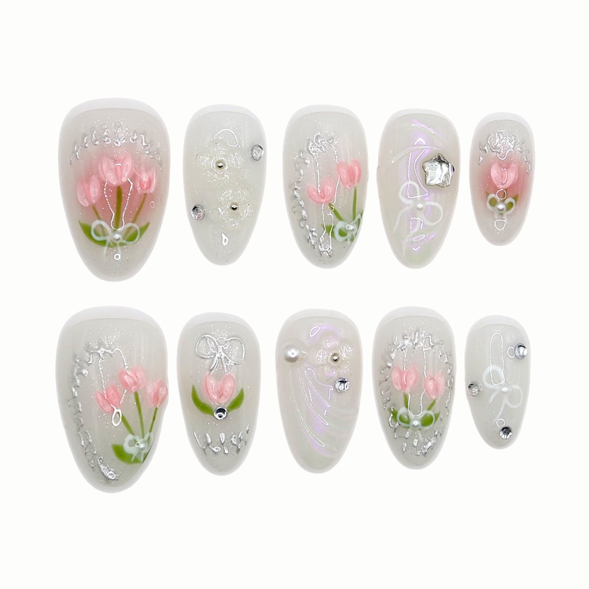 A soft milky-white base paired with hand-painted pink tulips and subtle pearl accents. Clean, gentle, and quietly romantic — like fresh flowers resting on sheer silk.