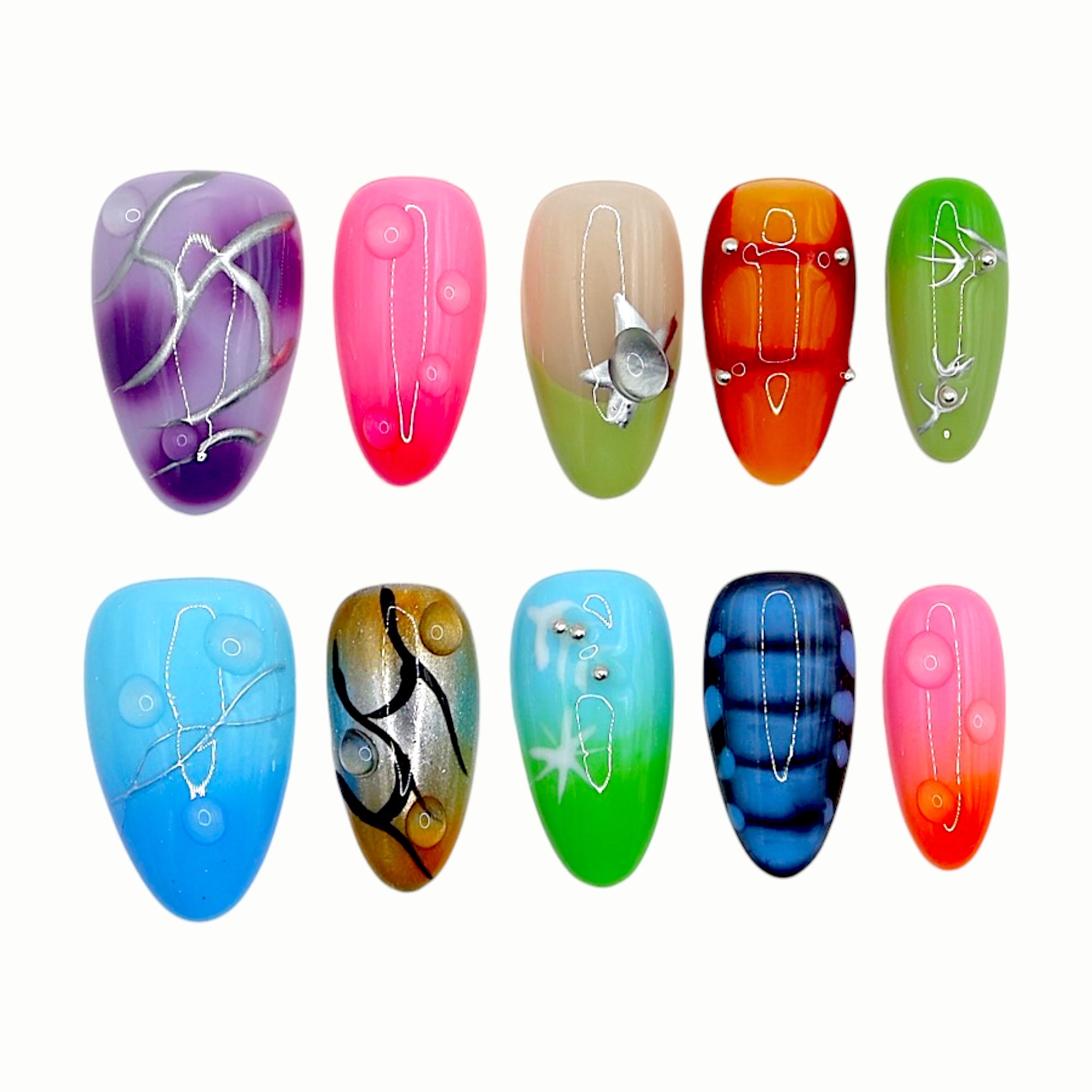 Vibrant neon airbrush gradients, liquid silver chrome lines, and abstract 3D water droplets. A rebellious, futuristic Y2K cyber-pop style.