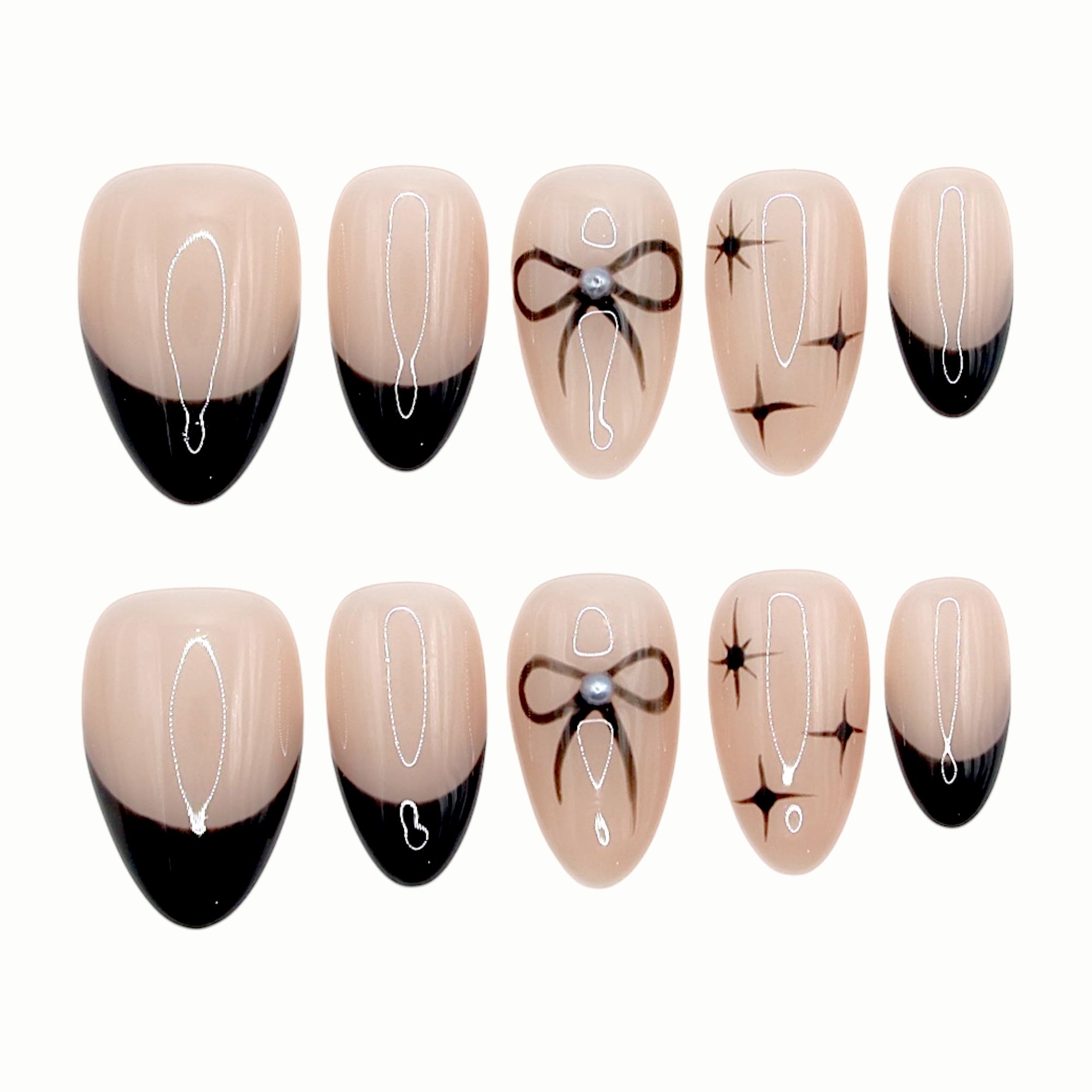 A nude base meets sleek black French tips in this elegant design. Delicate ribbon bows and pearl accents evoke the grace of satin evening gowns, while subtle star motifs add a hint of mystery. Minimal yet refined, this look embodies modern sophistication with a touch of allure.