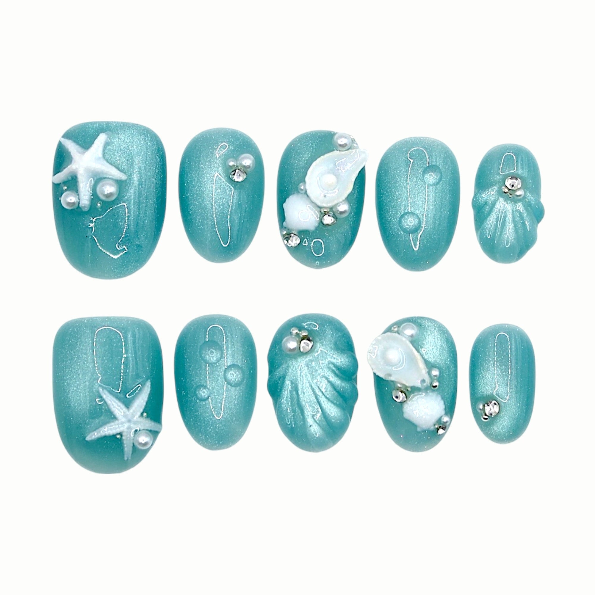 This design features a refreshing ocean blue base adorned with 3D starfishes, seashells, and pearls, capturing the mysteries of the sea at your fingertips. Sparkling rhinestones mimic the shimmering reflections on the water, creating a dreamy marine vibe. The look is both cool and playful, as if diving into the summer ocean to discover the wonders of coral and seashells.