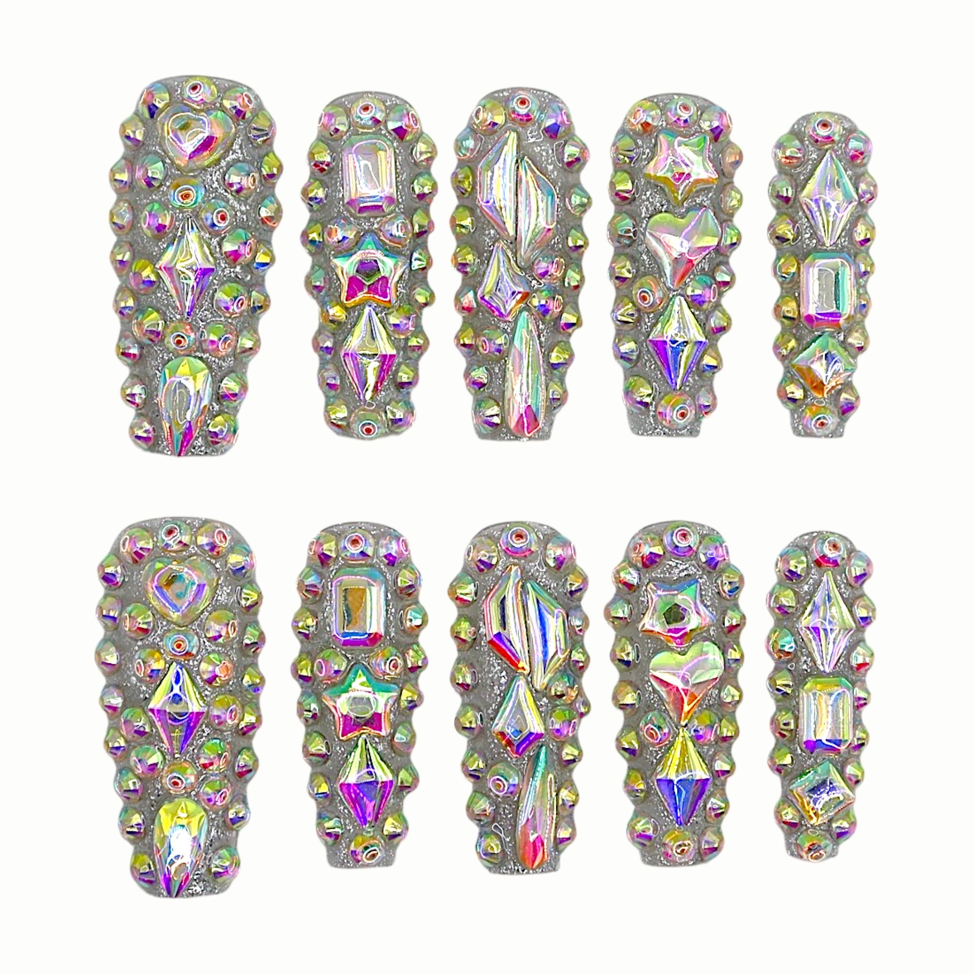 Silver glitter base fully encrusted with iridescent AB crystals and large geometric gems. Maximalist luxury that catches every ray of light.