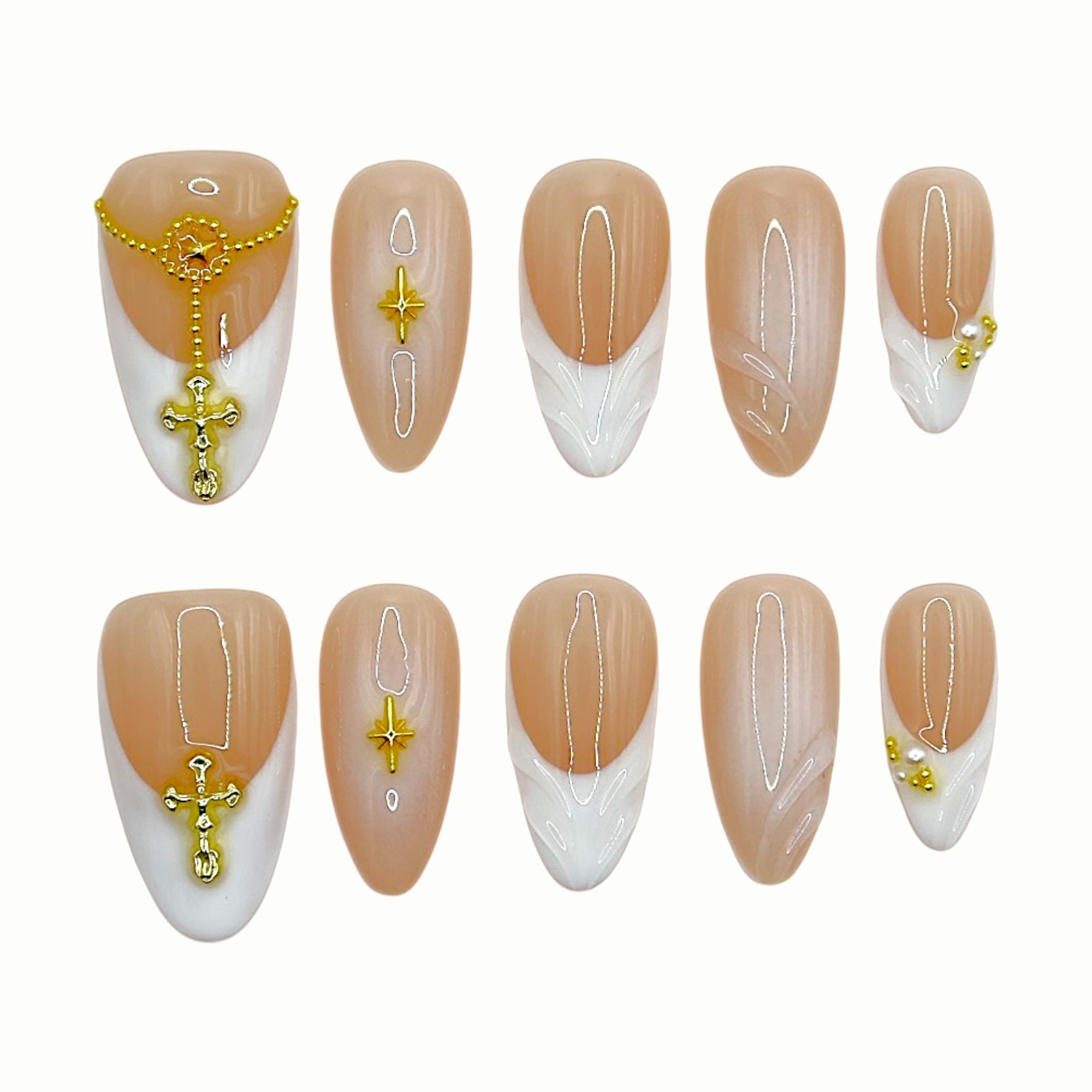 Gold symbols rest on soft nude tones, like a quiet blessing left on the skin.