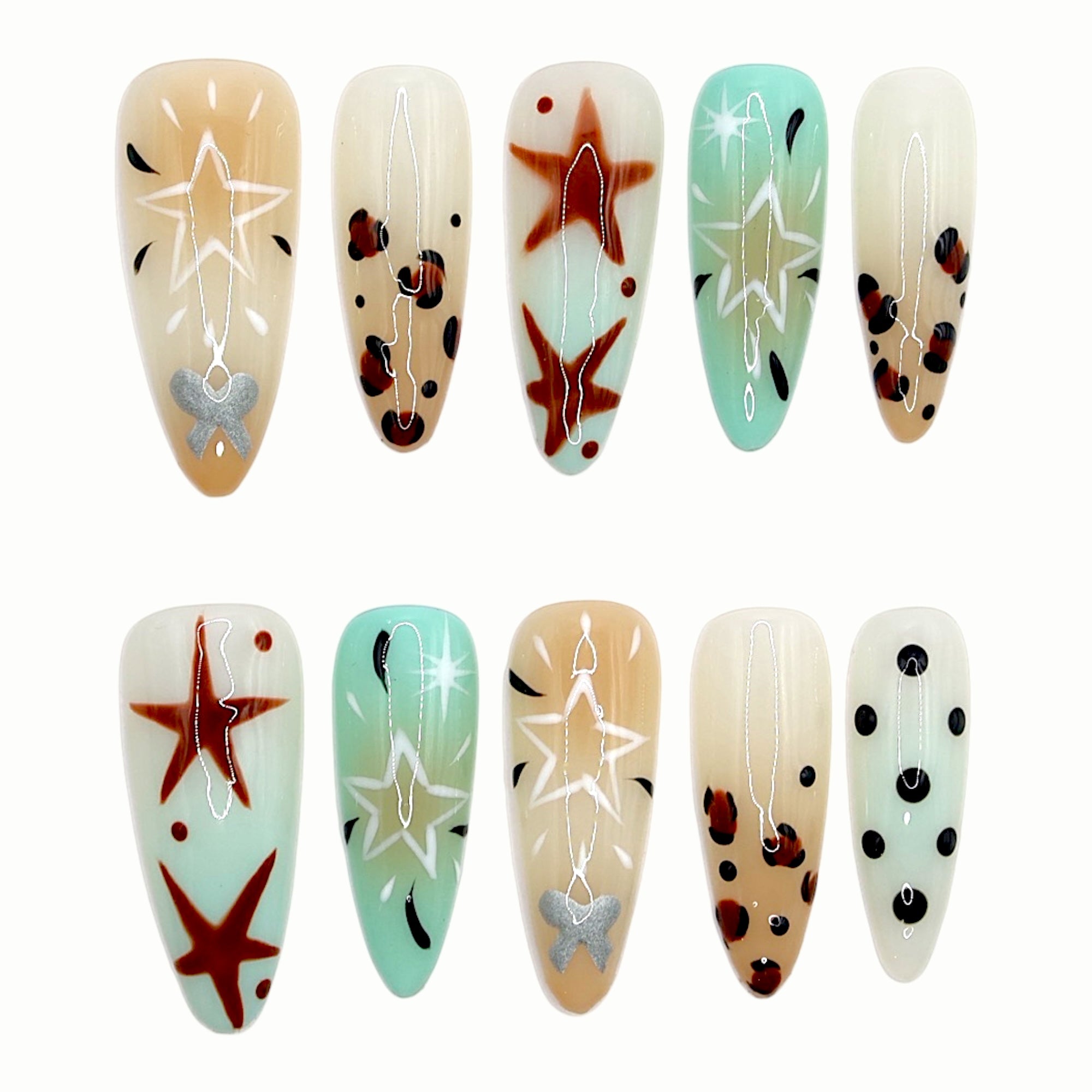 A blend of mint green and beige with star motifs and leopard spots — a perfect mix of wild charm and cool freshness. The silver bow adds a soft feminine twist, like starlight glimmering on a summer safari.