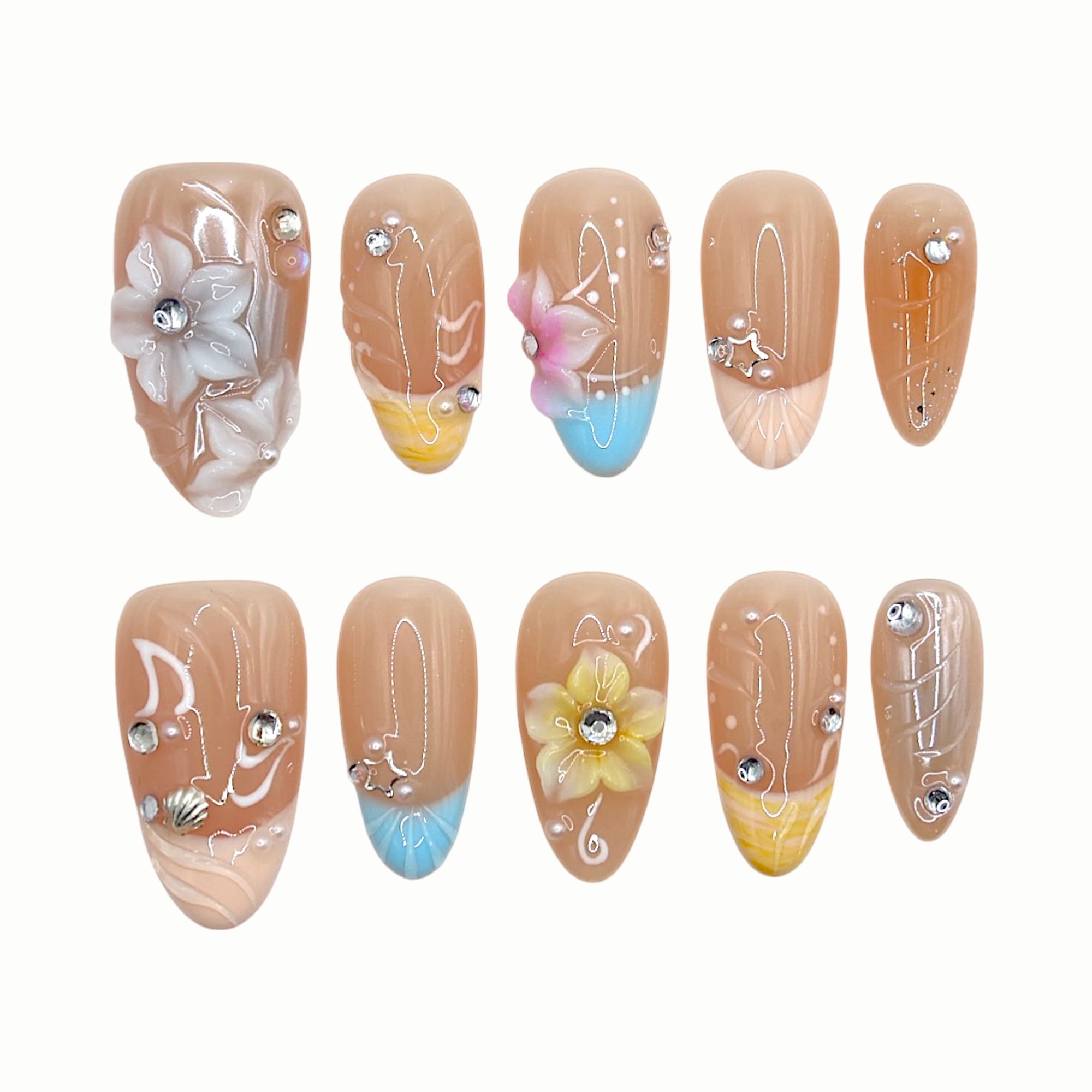 Soft nude tones with flowers and shell accents evoke a seaside garden touched by ocean breeze.