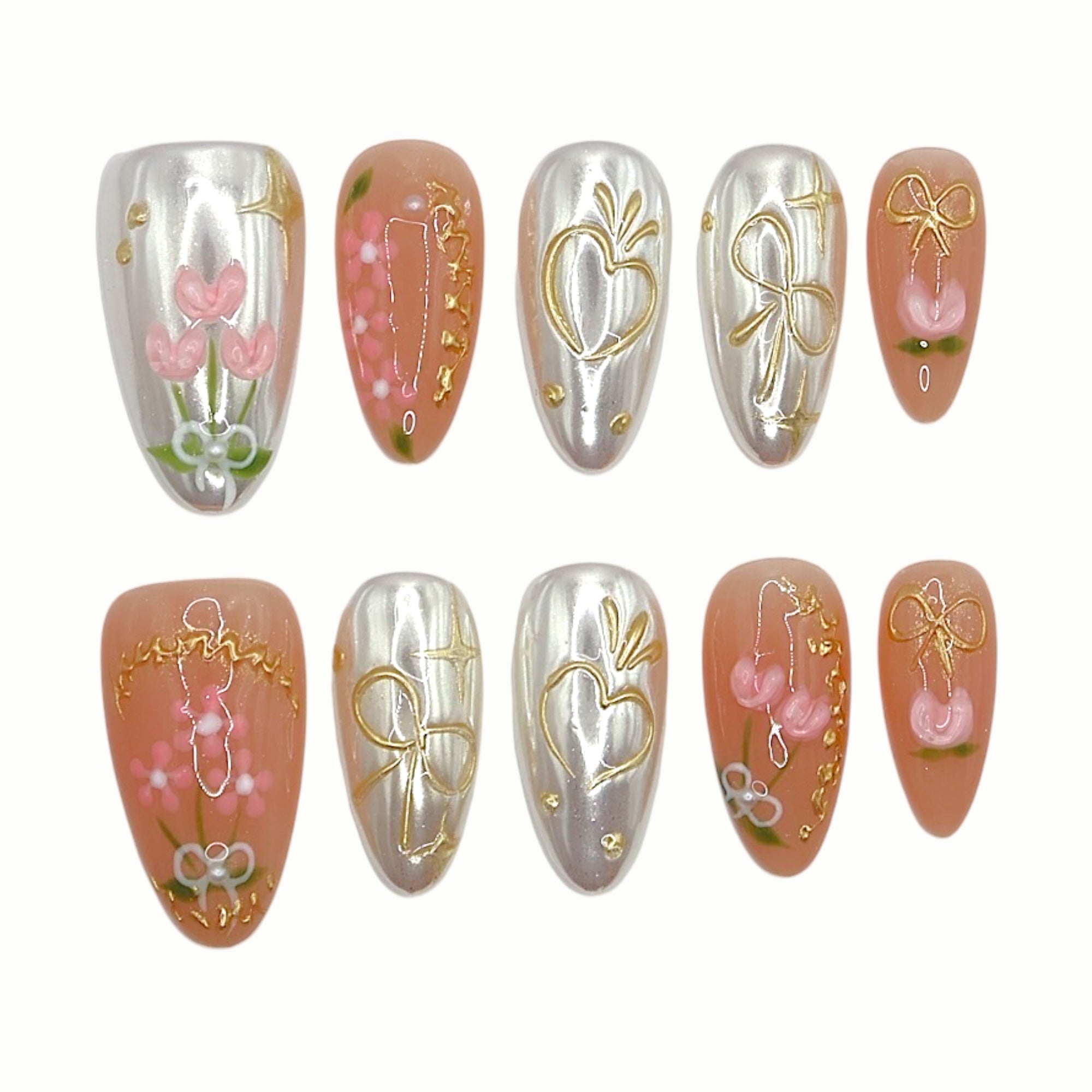 Blending edgy silver chrome with a gentle nude pink base, the design is adorned with exquisite hand-painted tulips, gold 3D bows, and textured relief elements. The contrast between cool-toned metallic textures and warm romantic motifs creates a highly artistic, vintage-modern aesthetic.