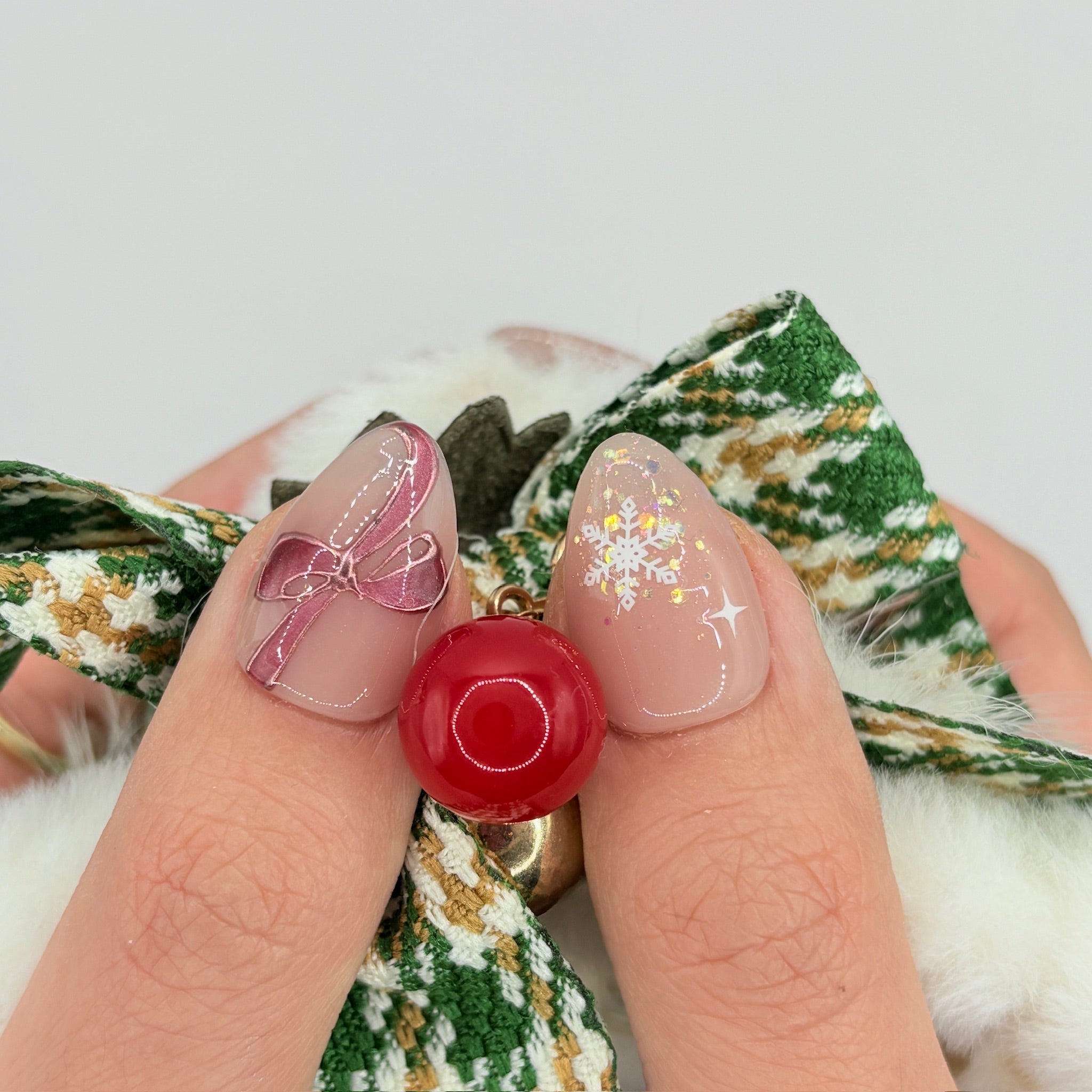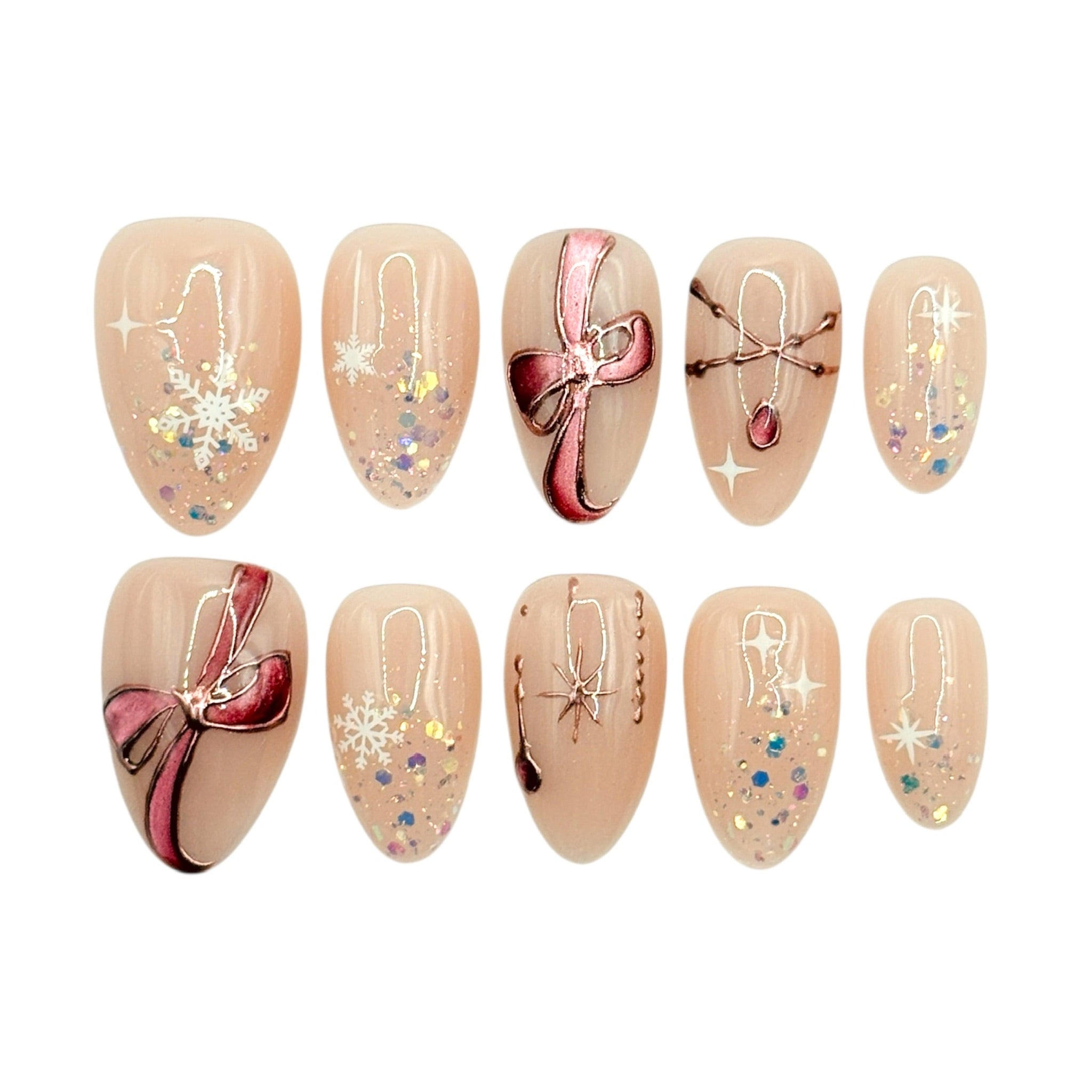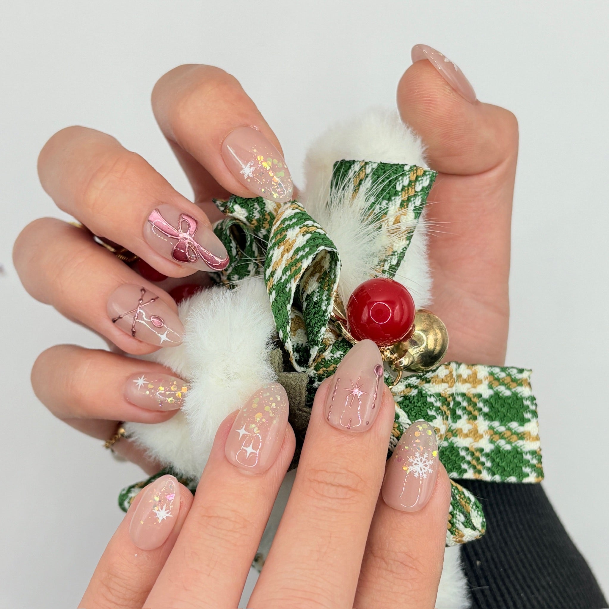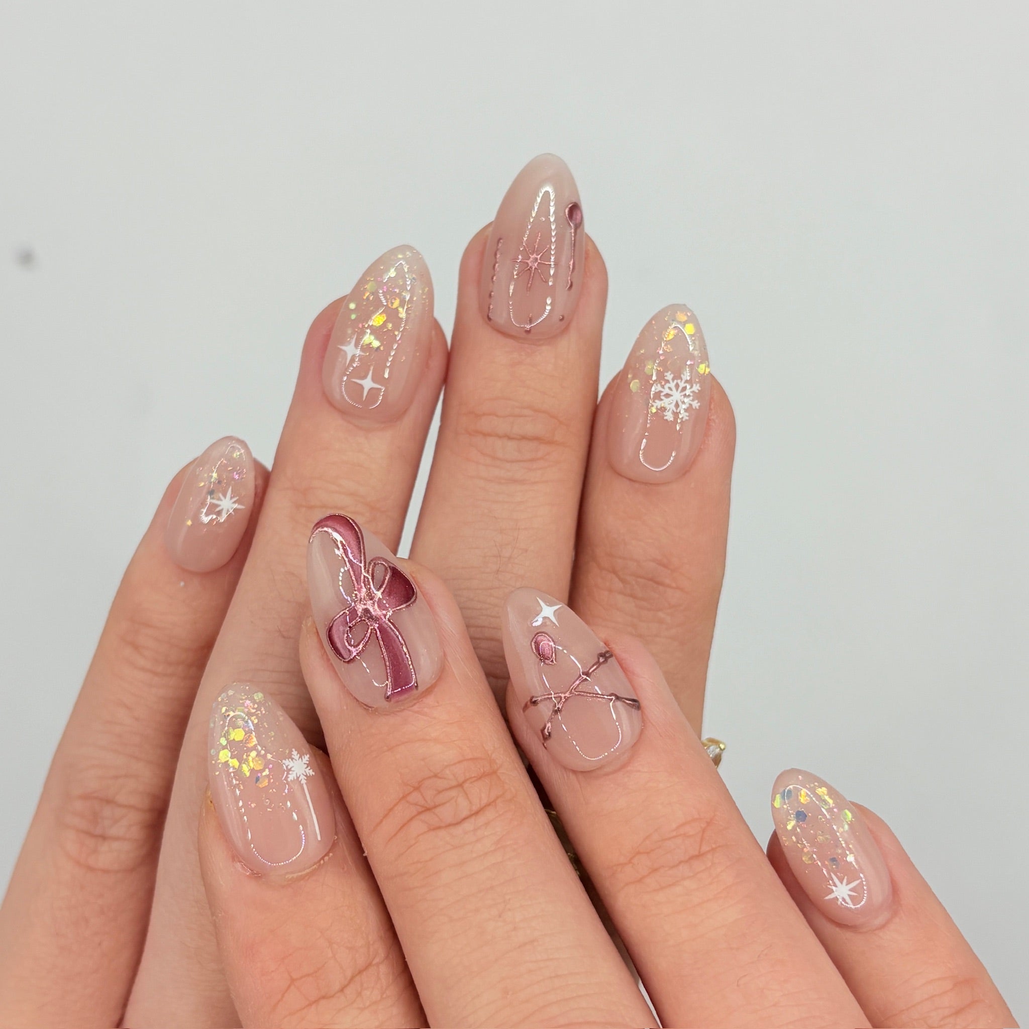 Main colors are sheer nude with soft champagne undertones, accented by delicate snowflakes, subtle glitter, and hand-painted ribbon bows. The design feels light, elegant, and quietly festive — a refined winter look that blends sweetness with understated luxury. Perfect for those who love soft glamour with a romantic touch.