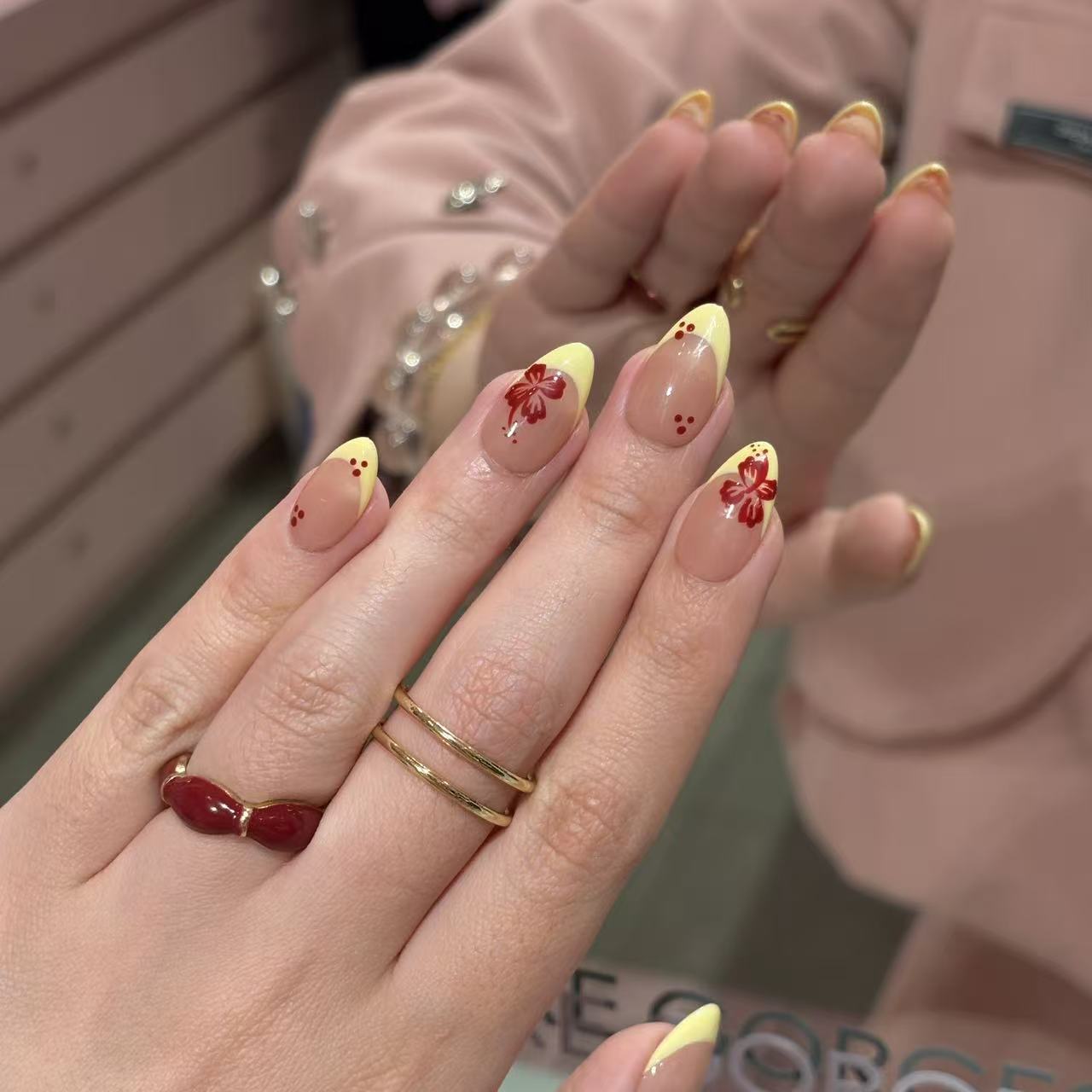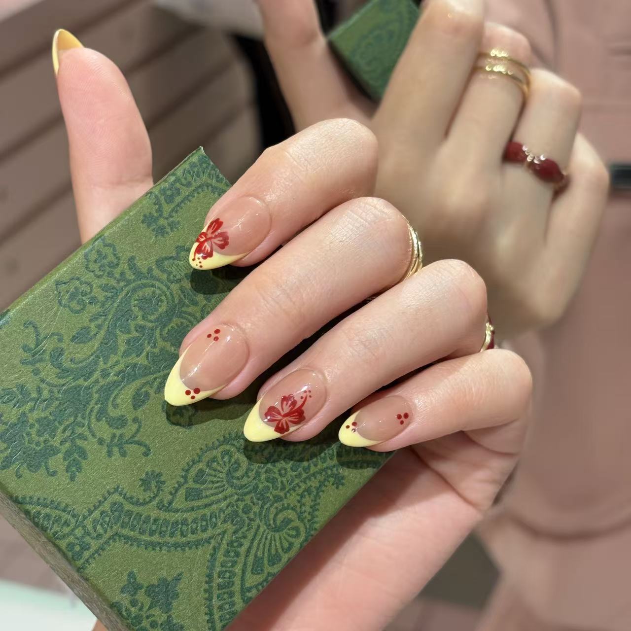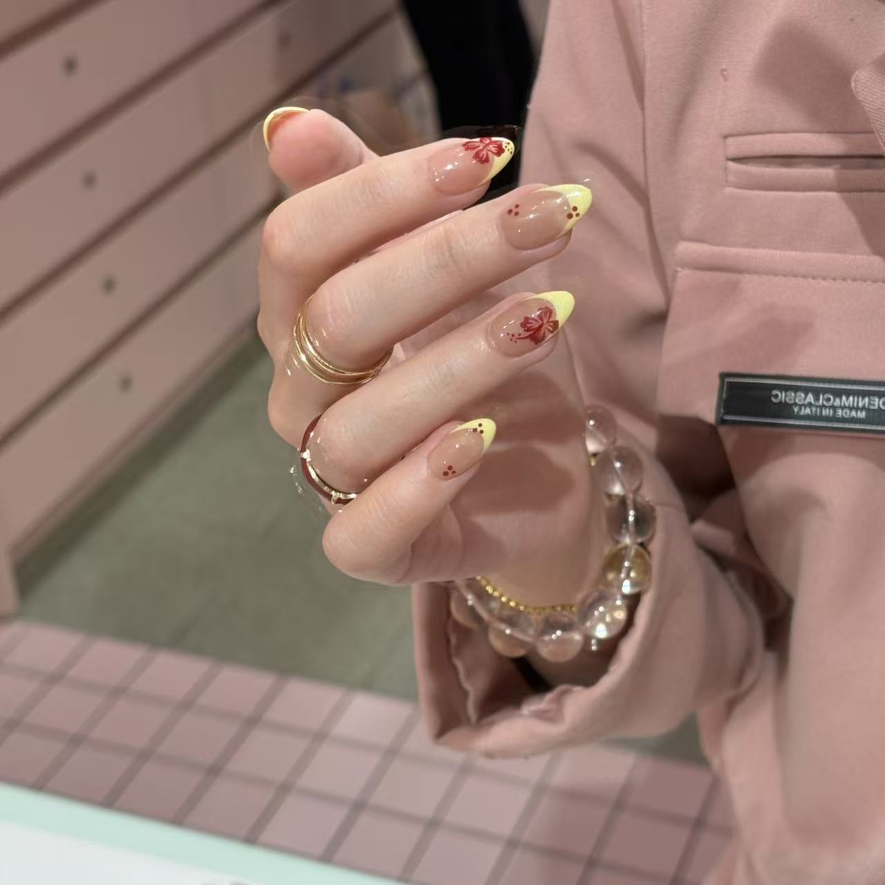 A soft nude base adorned with delicate red blossoms — like a spring motif unfolding from a traditional scroll. Finished with a creamy yellow French tip, this design blends Eastern floral elegance with modern minimal structure, offering a subtle yet festive expression for the New Year.