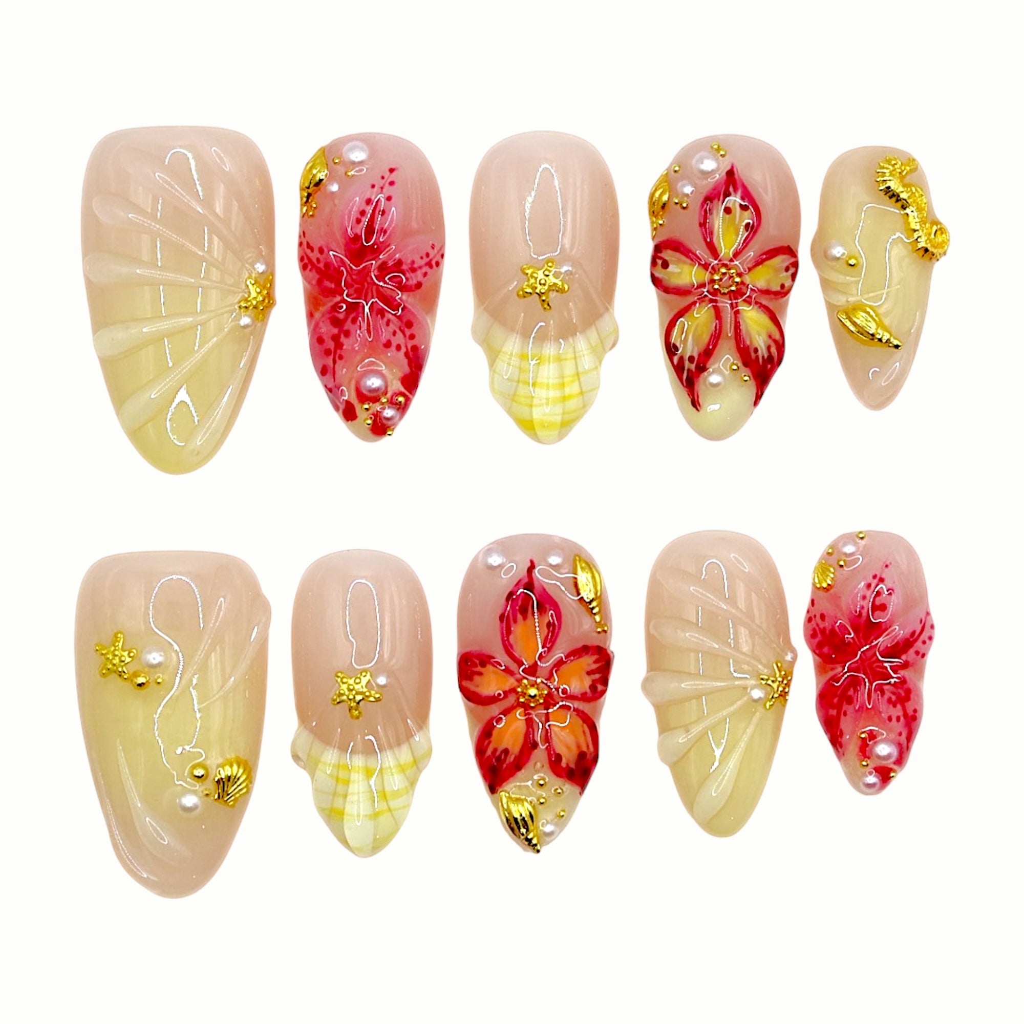 This nail set features coral red and creamy yellow tones, accented with 3D floral motifs and golden shell embellishments, capturing the essence of a tropical getaway. The vibrant colors evoke sunshine on the shore and blossoms in full bloom, while golden details bring a radiant touch of warmth and energy. It’s a lively, sun-kissed design full of vacation spirit.