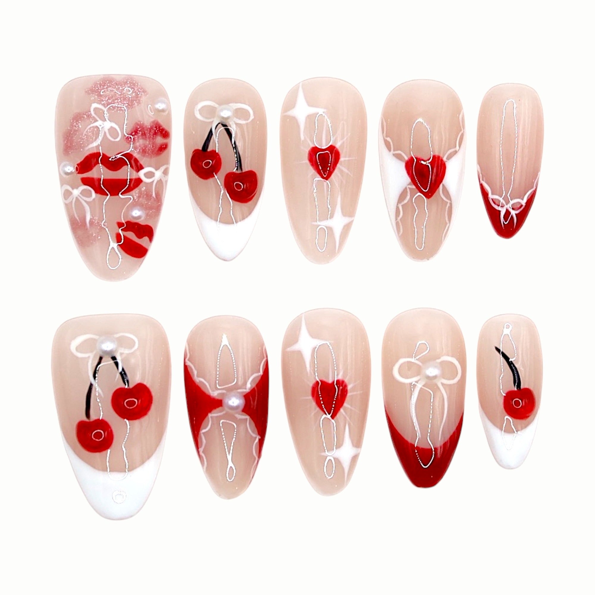 Centered on cherries and hearts, this design combines French white details and pearl accents to create a playful and sweet vibe. Red lips and bow lines add a girly and romantic touch, reminiscent of a refreshing summer love story. Perfect for dates, parties, or a sweet yet cool daily look.