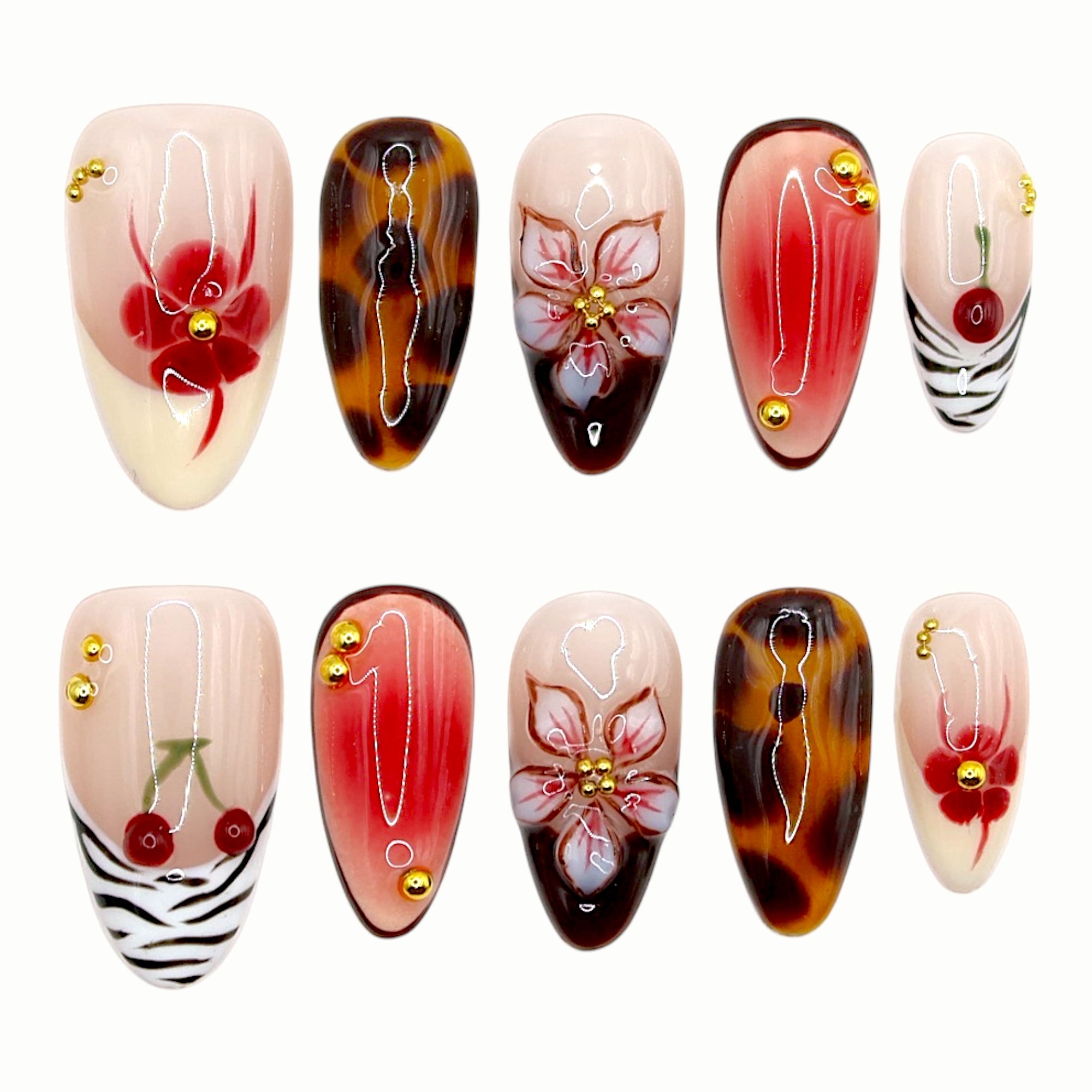 A fierce blend of cherry, tortoiseshell, and zebra patterns — rich red-brown ombré paired with glossy details. The golden beads and floral touches balance wild allure with playful charm.