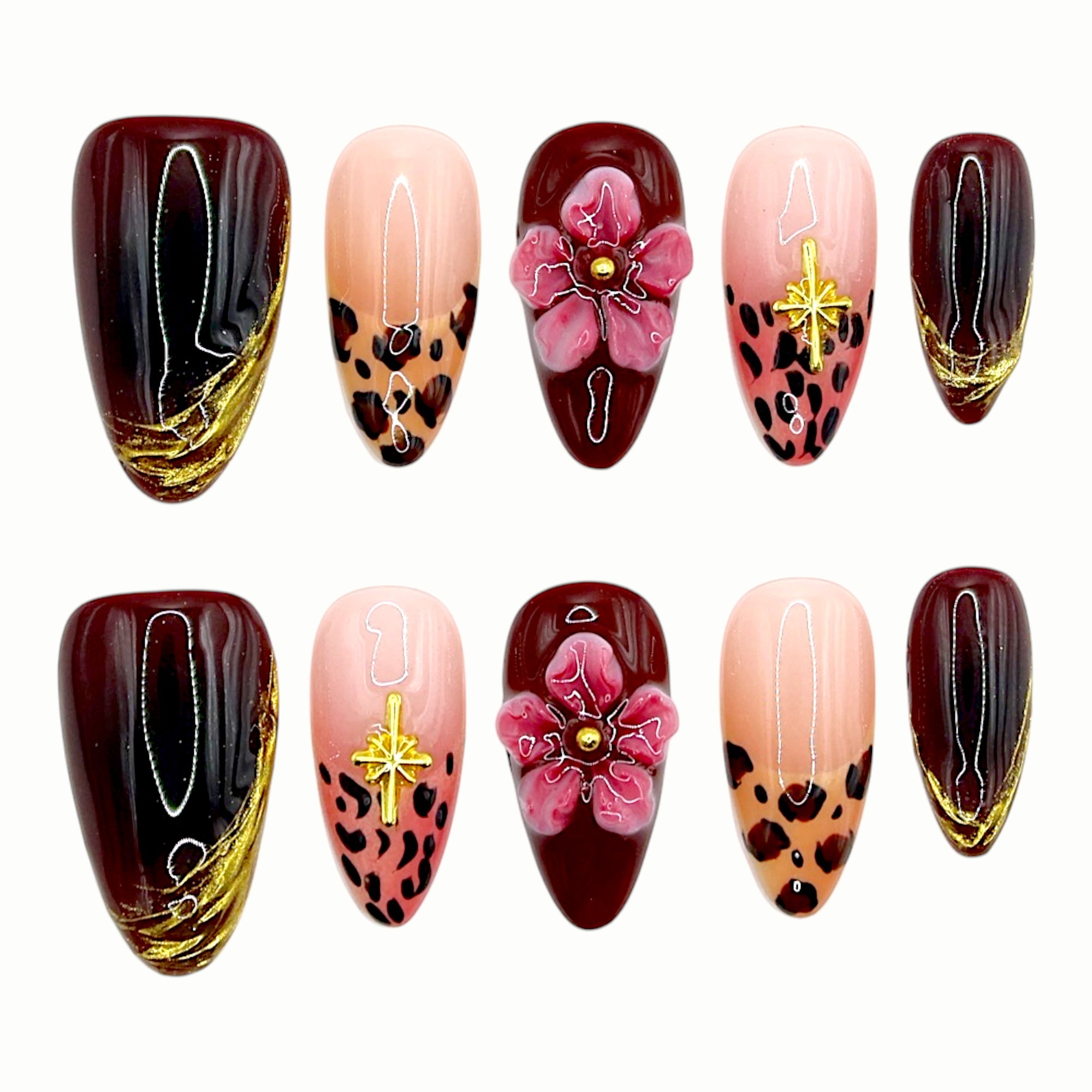 A daring mix of wine red and leopard print—sultry, confident, and fierce. The sculpted rose brings out both passion and power, made for women who own the night.
